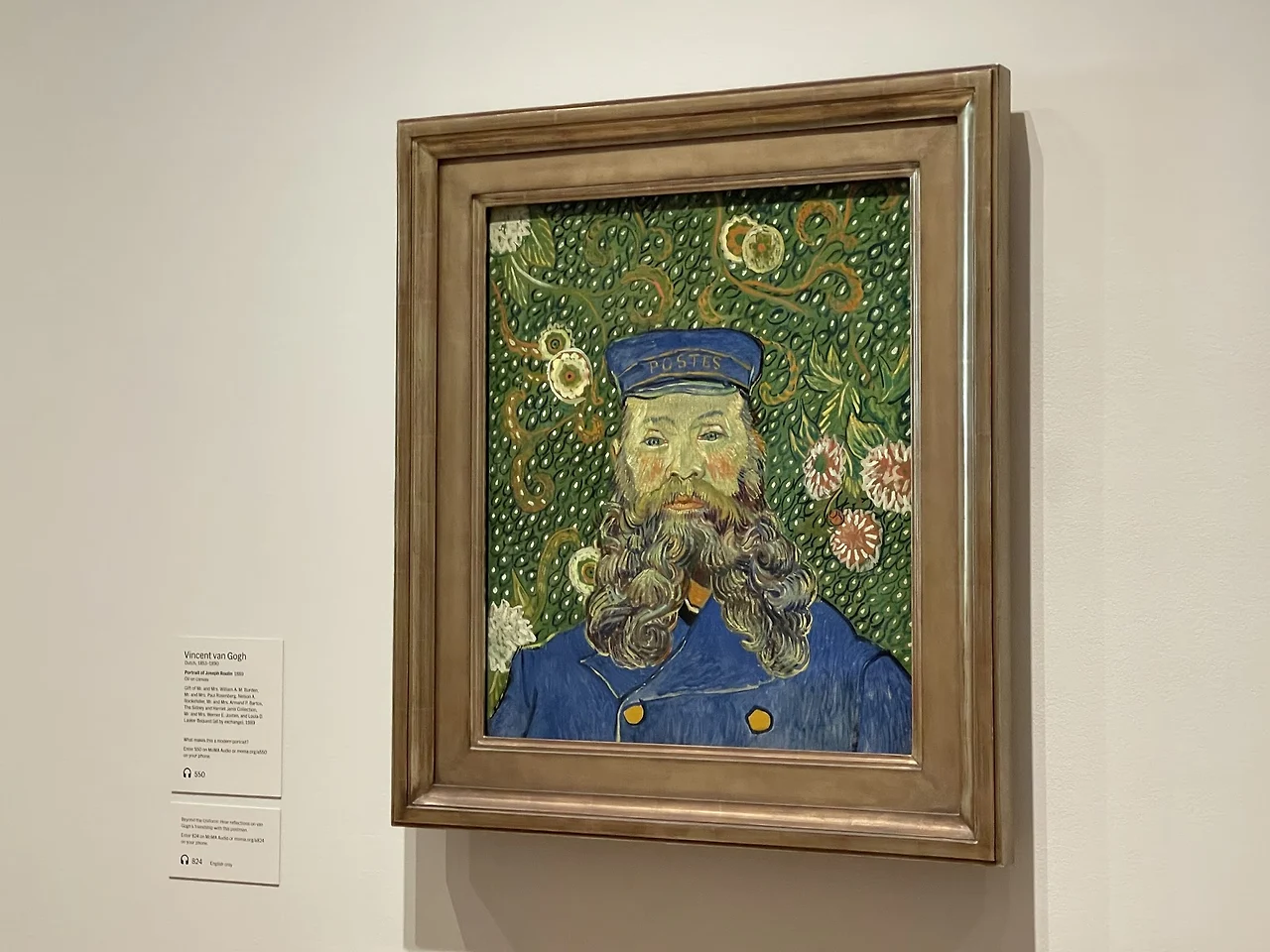 반 고흐가 프랑스 남부의 아를 Arles 에 외롭게 머물 때, 그의 술 친구였던 우체부 아저씨 조셉 룰랭의 초상화이다. 룰랭 뿐만 아니라, 룰랭의 가족들과도 가깝게 지내고 좋아해서, 어린 세 아이와 부인까지 룰랭 패밀리에 관한 많은 그림들을 그렸다. 소용돌이 치는 꽃들과 룰랭이 늘 자랑스러워 했던 우체부 유니폼을 입고 있는 룰랭의 초상화를, 반 고흐는 ‘the modern portrait 현대 초상화’라 일컬으며 흥분하였다.