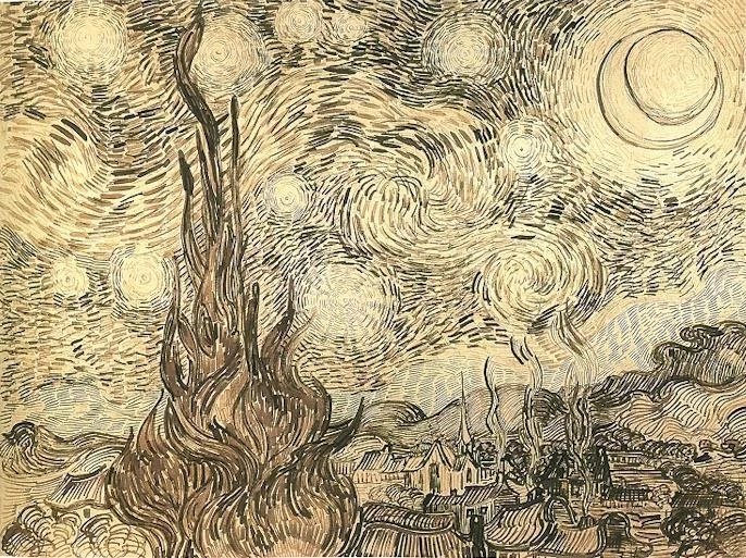이 작품을 단색으로 드로잉 한 작품 Drawing, pen and ink on paper이 남아 있는데, 너무나 꼼꼼하게 펜으로 드로잉한 작품이 주는 느낌 또한 너무 좋다. 고흐의 디테일하고 섬세한 성격과 풍부한 감성을 함께 느껴볼 수 있는 작품으로 여겨진다. (Shchusev Museum of Architecture, Russia)