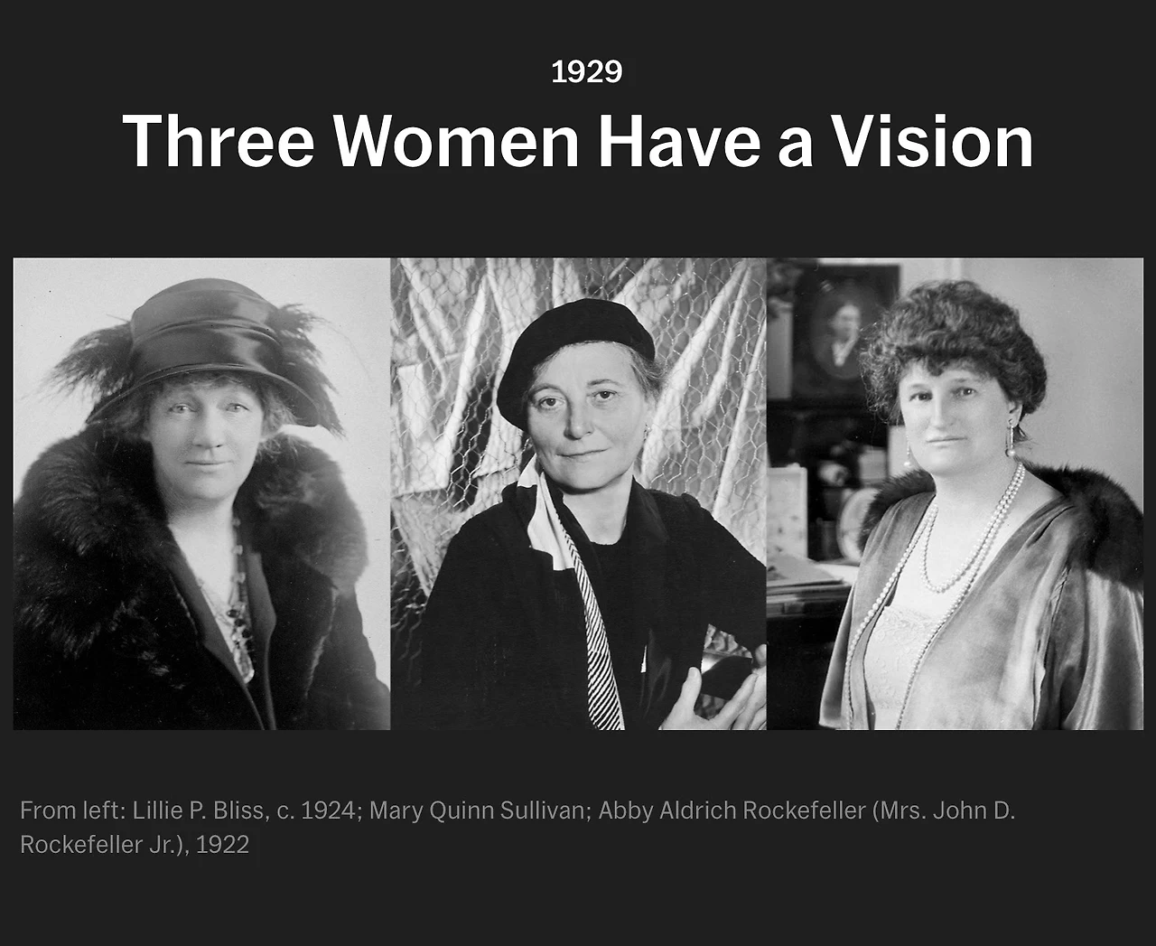 1928년 미국 대공황 The Great Depression 의 시기, 경제적으로 어렵던 그 시기에, 진취적이고 영향력 있는 예술 후원자인 세 여인 - 블리스 님, 셜리반 여사님 & 록펠러 주니어 여사님 (Miss Lillie P. Bliss, Mrs. Cornelius J. Sullivan, and Mrs. John D. Rockefeller, Jr.) - 이 한 뜻을 가지고 함께 하게 된다.