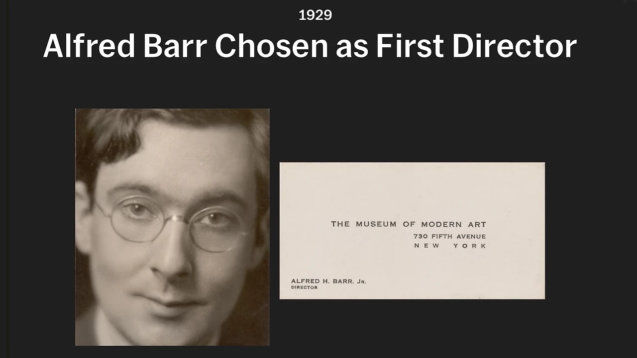 첫 디렉터로 선임된 알프레드 바 Alfred H. Barr Jr. 는 모마가 오늘날 미술품뿐만 아니라, 건축, 디자인, 드로잉, 인쇄, 영화, 미디어, 공연, 사진 등 폭넓고 다양한 분야의 뮤지엄이 되는 컨셉과 조직을 만드는 혁신적인 플랜을 만들었다.