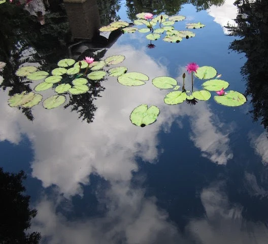 물 위에 떠 있는 수련 또한 멀리서 봤을 땐 꽃 모양처럼 보이게 살짝 그려 넣은 줄 알았는데, 가까이서 보니 꽃 색깔이 너무나 이쁘다. 꽃 안에 노란색, 하얀색, 붉은색 등 다양한 색을 담아내고 있다. 이렇게 아름다운 수련일 줄이야… 수련의 잎 또한, 또 다른 하얀 구름 조각처럼 물 위를 가벼운 몸을 맡기며 놀고 있는 듯하다.