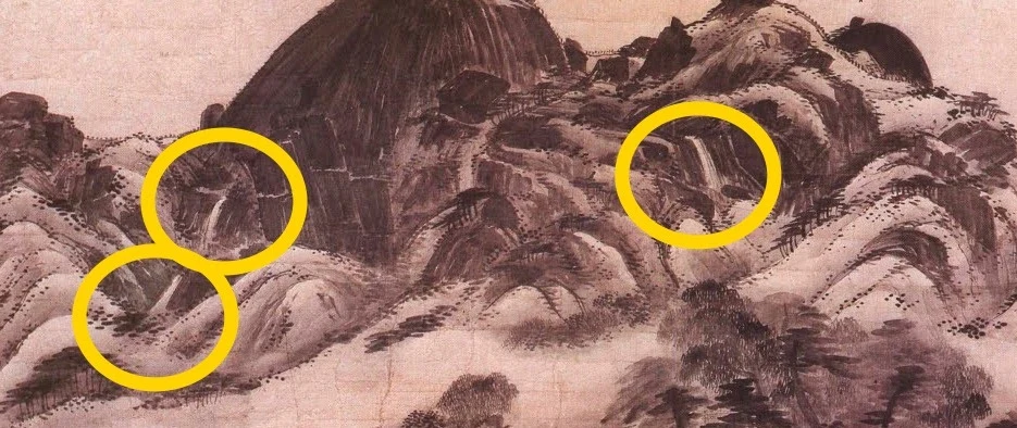 또한, 보통의 인왕산에는 보이지 않는 폭포를 3개나 그려 넣어 비가 얼마나 많이 왔는지 가늠하게 해 준다.