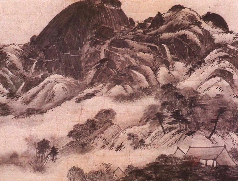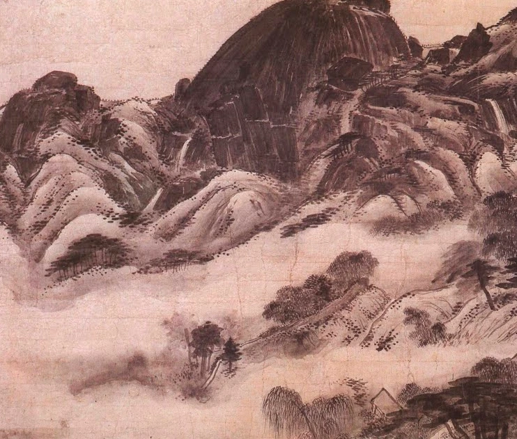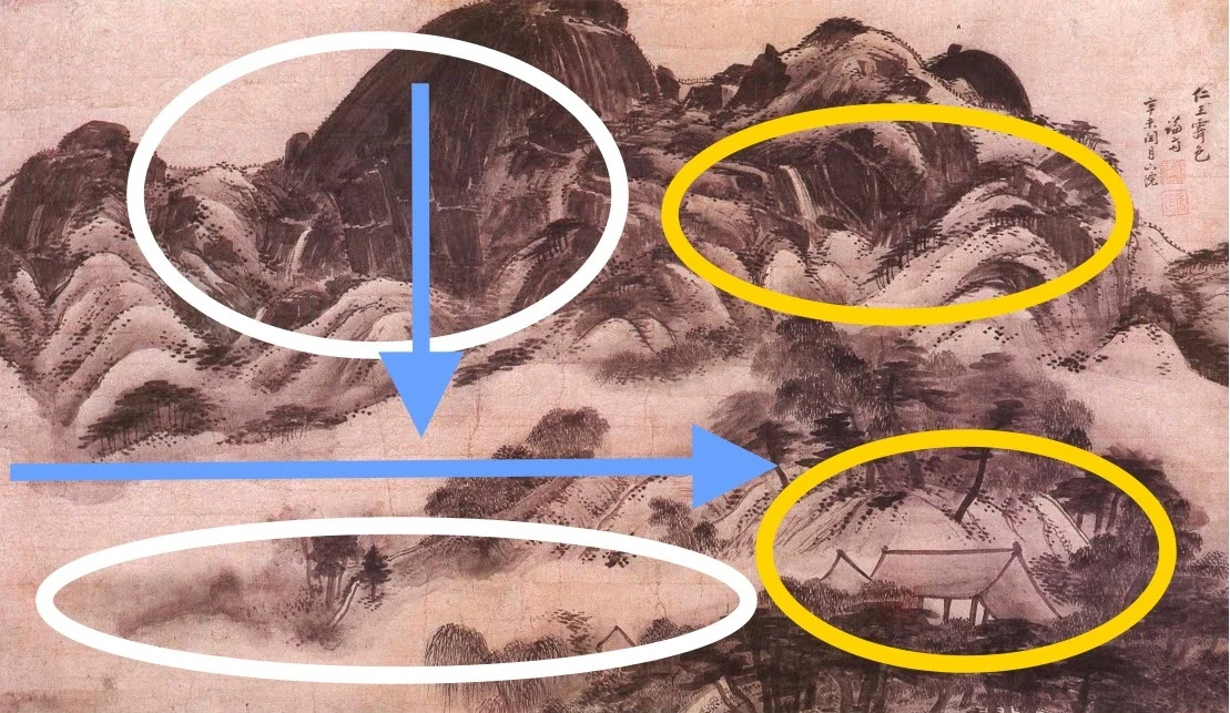수직으로 내리꽂는 바위의 형상과 수평으로 넓게 흐르는 구름과의 대조, 어두운 검정의 바위, 숲들과 밝은 하얀 구름, 안개와의 대조, 역동적인 산의 형세와 정적이고 평화로운 마을 집과의 대조 등이 너무나 조화롭게 잘 어우러진 작품이다. 잠깐, 여기에서 이런 대조와 조화가 잘 어우러진 또 다른 작품이 생각난다.