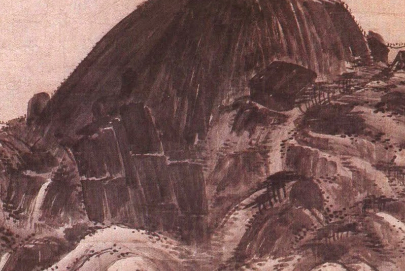 붓의 힘이 엄청나구나. 실제 인왕산에서 보이는 하얀 바위가 아니라 검은 바위의 모습으로 그렸다. 비 온 뒤, 물을 먹은 바위의 모습이라 검게 표현했다고 보기도 하는데 그보다는 검은 먹으로 바위의 웅장하고 묵직한 느낌을 맘껏 표현해 낸 듯하다. 검은 붓선이 결결이 살아 있어 웅장한 바위의 표면 결처럼 느껴진다. 붓에 먹을 흠뻑 적시고 눕혀서 힘 있게 여러 번 덧칠하여 그려낸 기법(적묵법)을 사용하였다고 한다.