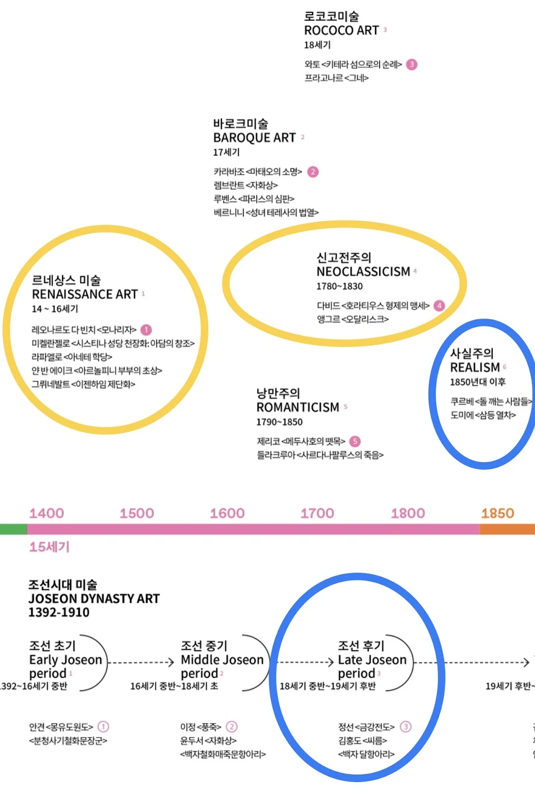 르네상스 Renaissance 에서 신고전주의 Neoclassicism 정도의 사이이다. 신고전주의 또한, 고전인 르네상스로 돌아가자 이니 크게는 르네상스 미술의 영향권에 있다 할 수 있겠다. 여기서 놀라운 건, 그 다음으로 오는 사실주의 Realism, 현실의 일상적인 리얼리티 Reality 를 있는 그대로 그리자는, 서민의 삶을 그리는데 관심을 보였던 서양의 사실주의보다 우리의 서민화인 풍속화가 한 세기 정도 먼저 앞서 나왔다는 건, 지나친 한국인의 시각에서의 해석일까? 우리 민족이 새삼 자랑스럽다.
