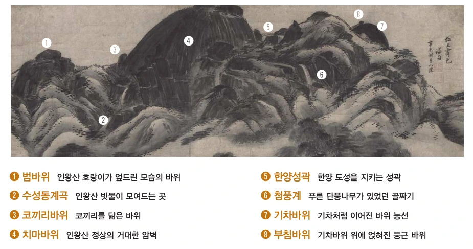 정선의 마음으로 그린 인왕산은 실제의 인왕산과 얼마나 다를까? 얼마나 비슷하게, 다르게 표현했을까?