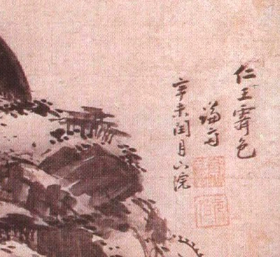 위에 잘린 바위는 의도적이었을까? 전체 바위가 온전히 나온 것 보다는 의도적으로 잘라서, ‘얼마나 큰 바위이길래 저렇게 다 담지 못했을까’ 싶은 생각이 들게끔 한 게 아닐까 추측해 보았지만, 찾아보니 원래는 전체 바위의 모습으로 온전히 그렸는데, 후대에 표구하다가 안타깝게도 손상되었다고 한다.