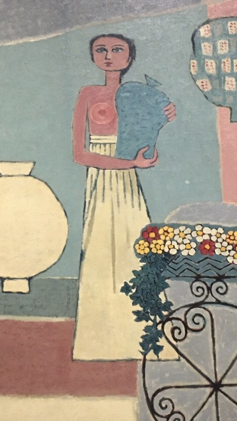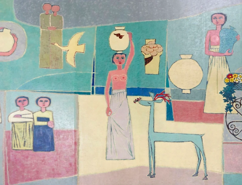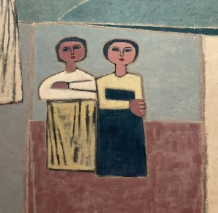 앉아 있는 여인들이 너무 귀엽다. 우리의 한복을 입고 있는 아이들이다. 오똑한 빨간 입술이 보이는가? 표정이 너무나 귀엽다. 너무나 활기차고 밝아 보이는 우리 여자아이들의 모습처럼 보인다. 뒤에 서 있는 두 여인도 둘이 손을 꼭 잡고 있는 모습이 너무나 사랑스럽다. 서 있는 여인들의 얼굴도 그렇고, 등장하는 모든 여인들의 얼굴이 달항아리의 모양과 똑같다. 우리가 달항아리이다.