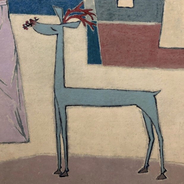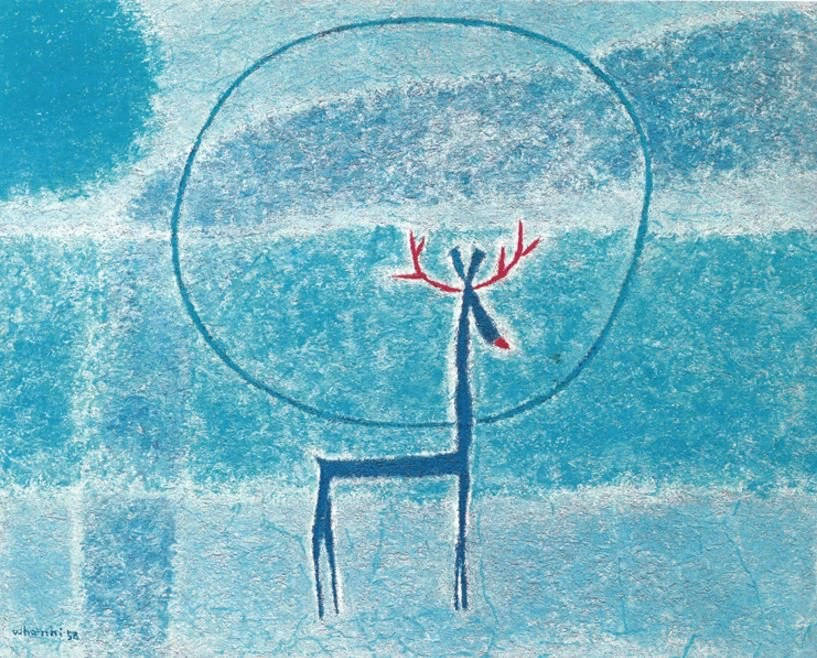 빨간 뿔이 있는 수사슴이 빨간 매화꽃을 입고 물고 있다. 늠름한 수사슴의 모습보다는 뭔가 로맨틱한 사랑을 아는 사슴의 모습으로 보인다. 옥색이 너무나 이쁘다. 고구려 벽화 등 우리 그림에 자주 등장하는 사슴을 참 현대적으로 잘 풀었다. 예쁜 사슴이다.