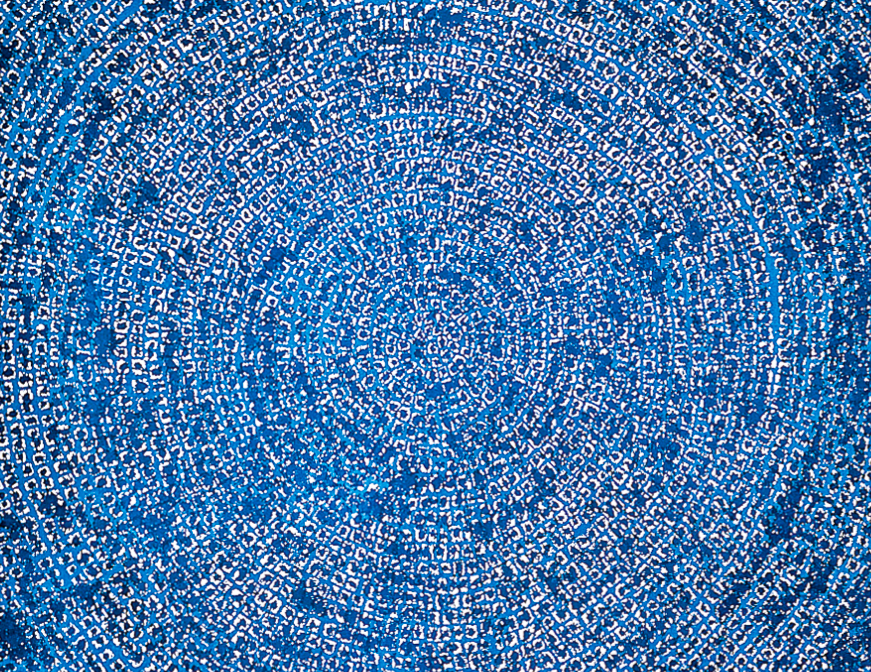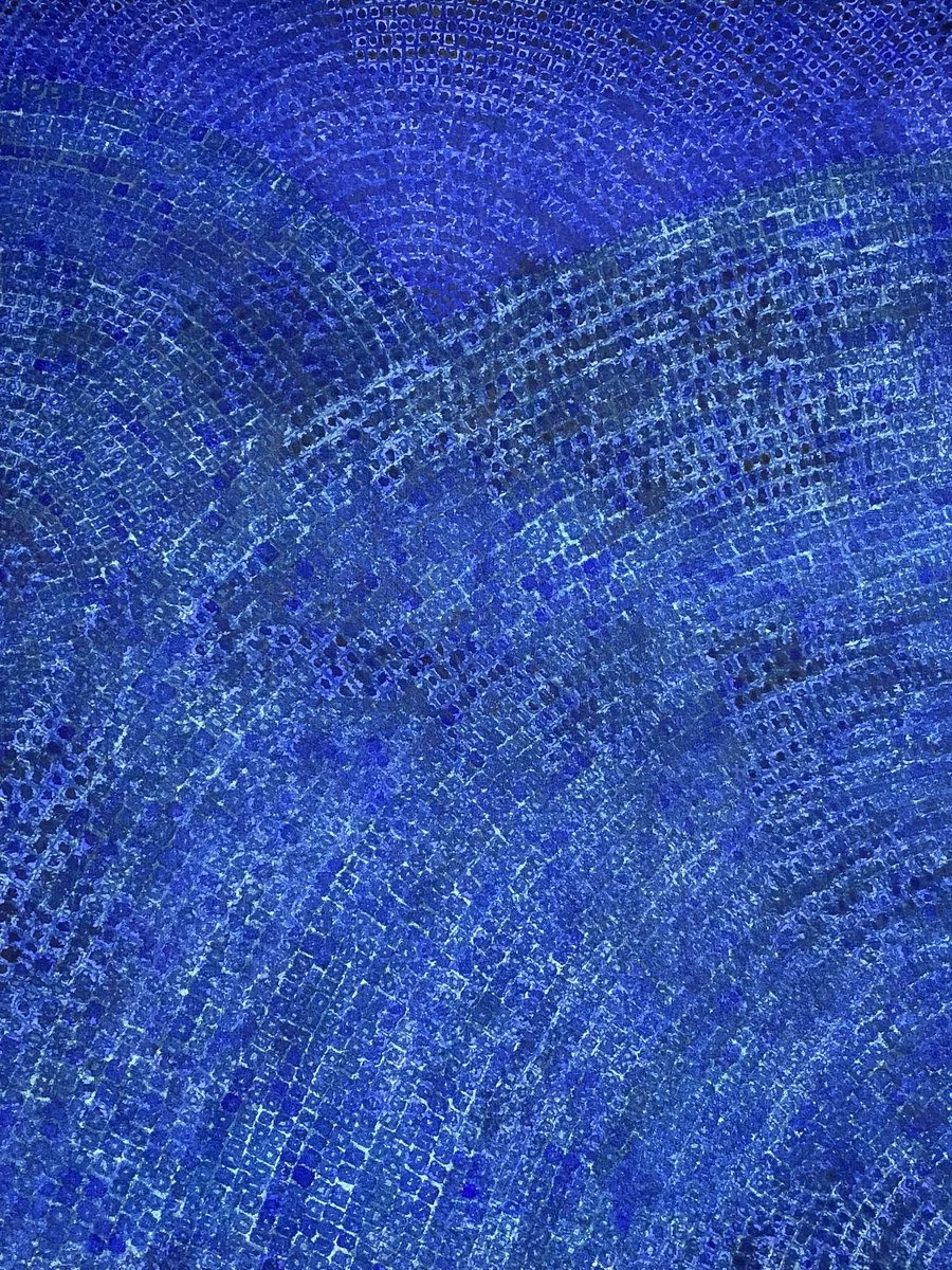 산울림이 동심원을 그리면서 퍼져나간다. 동심원이 겹쳐지면서 퍼져나간다. 사각틀 안에서는 더 큰 울림이 느껴진다. 더 깊은 울림 속으로 들어가는 느낌이다. 사각틀 밖에서는 점을 찍으면서 번진 흔적들이 그대로 남아 옅은 진동을 내며 사라지는 듯하다. 중간의 하얀 선은 하얀 선을 그린 게 아니고 그리지 않고 남겨둠으로써 만들어진 선이다. 얼마나 집중해서 그려야 저렇게 그릴 수 있단 말인가? 산울림, 나의 마음에도 울림이 퍼져 나간다.