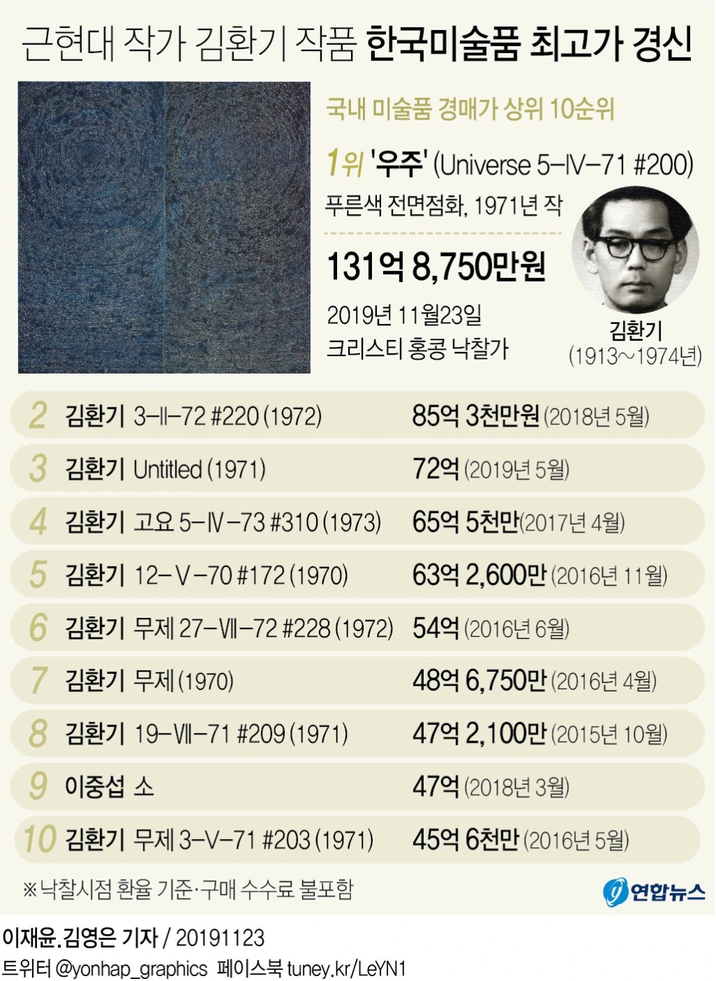 한국 미술 경매에서 가장 비싼 Top 10 작품 중, 9개 작품이 그의 작품으로 유명하다. ‘환기불패’ 라고 불릴 만큼, 그의 작품은 구매 후 손해보지 않는 걸로 유명하며, 매번 새롭게 갱신되는 비싼 거래의 가격으로 김환기 작품을 이기는 작품은 다시 김환기 작품! 이라고 회자되기도 한다. 가격이 그 작품의 절대 가치 평가의 기준은 아니지만, 많은 사람들이 그만큼 공감한다는 점에서 대단하다고 하지 않을 수 없다.