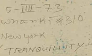 김환기 작품 뒷면. 1973년 4월 5일 그리기 시작한 김환기 작품의 #310번째 작품, 뉴욕, ‘TRANQUILLITY 고요’.