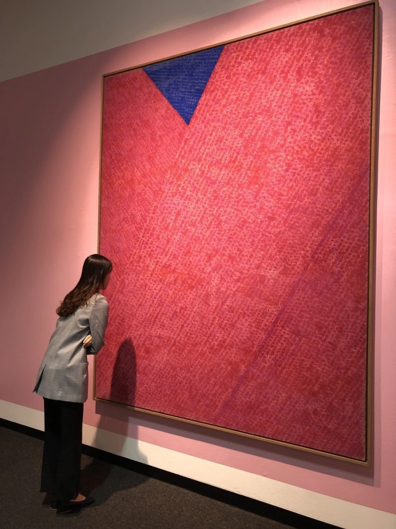 김환기의 빨간색 점화 ‘3-II-72 #220’을 유심히 들여다보고 있다. /서울옥션