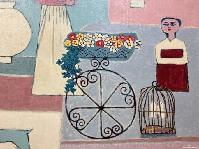 꽃을 파는 수레와 새를 파는 새장 뒤에 앉아 있는 노점 소녀, 저 뒤에 단순화된 나무들과 조선 남대문의 모습 등이 너무나 정겹다.