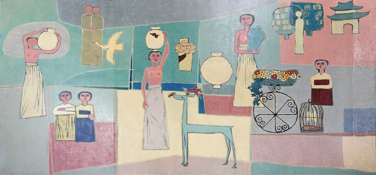 김환기, 여인과 매화와 항아리, 1956년 / 김환기, 항아리와 여인들, 1951년, 캔버스에 유채, 54 x 120 cm, ⓒ 환기재단, 환기미술관