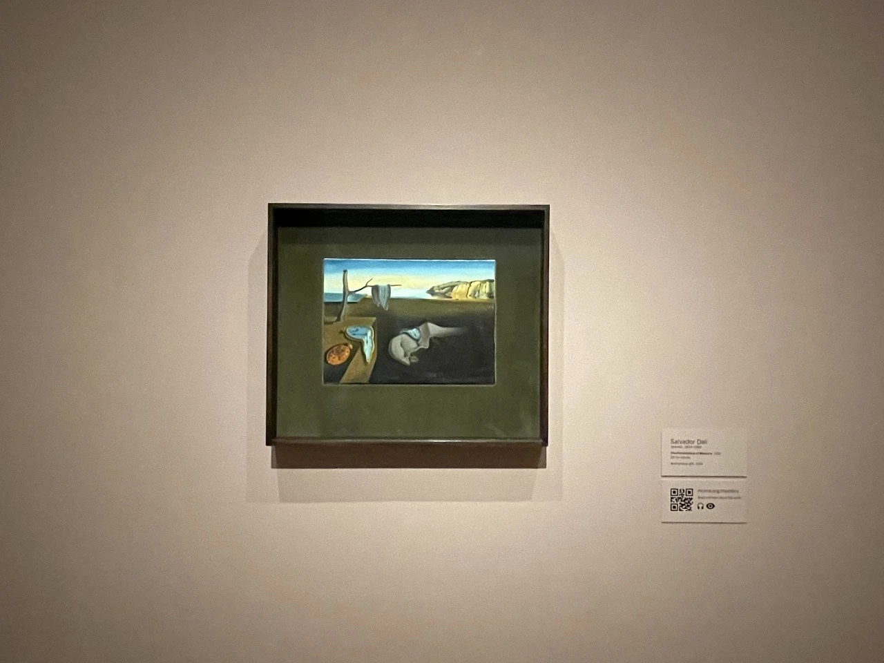 그의 스페인 고향인 카탈로니아 Catalonia 의 캡드크루스 Cap de Creus 해변가, 저 뒤에 보이는 바위 절벽이 까망베르 Camembert 치즈 덩어리로 보이고, 앞의 시계들은 그 치즈가 녹아내리는 것처럼 흐느적거리며 녹아내리는 모습이다. 정확하고 딱딱한 이성적인 속성을 가진 시계가 소프트하게 흐느적거리며 녹아내리는 반대 속성의 시계로 그려져 있다. 속성의 변질을 보여주는 것 같기도 하고, 그가 존경한다던 아인슈타인의 ‘상대성 이론’에 기초하여, 모두에게나 정확한 시간이 아니라 누구에게는 빠르고 누구에게는 느린 상대적인 시간의 개념을 표현한 것 같아 재미있다. 시계, 시간의 비틀기이다.