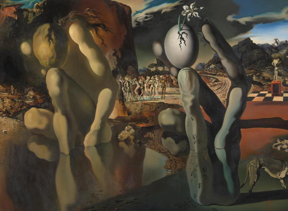 왼쪽에는 앉아서 머리를 무릎에 대고 물에 비친 자신의 모습을 보고 있는 나르키소스의 모습이 보이고, 가운데에는 나르키소스를 사랑하지만 버림받은 여신들이 몰려 있다. 오른쪽에는 그의 모습이 죽어, 돌로 변해 있는 암석의 나르키소스 조각상이 보인다. 그런데 자세히 보니, 어? 엄지손가락 위에 알을 잡고 있는 손가락의 모습이다. 그 알에서 깨고 나온 꽃이 수선화(영어 이름 Narcissus)이다. 여기서도 달리의 특기인 하나의 이미지로 다양한 실루엣이 보이게 만드는 기법으로 장난을 쳐 놓았다. 재미있다. 이제 다시 왼쪽을 보니, 앉아 있는 나르키소스가 달리 보인다. 옆의 조각상처럼 손으로 수선화의 알뿌리 씨앗을 잡고 있는 모습으로 보인다. 그의 머리카락은 잔뿌리로 변해 있다. 달리는 나르키소스를 수선화로 이렇게 변신시켰다. 자기애가 최고였던 달리가 곧 나르키소스였다. 그를 만난 프로이트는 이후에 이렇게 말한다.