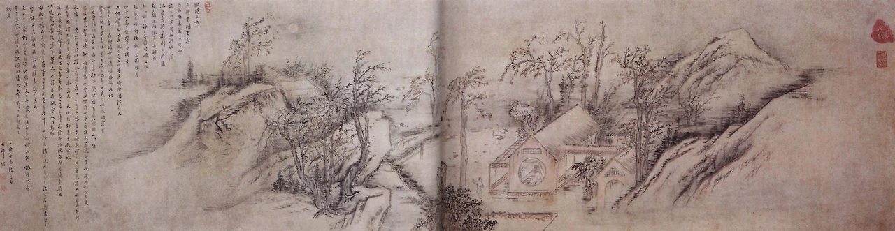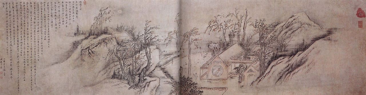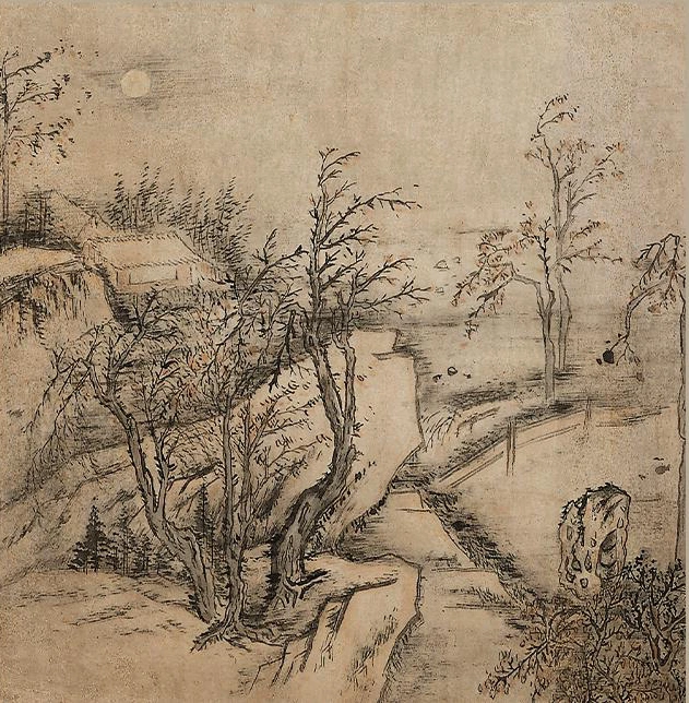 저 위에 환한 달이 떠 있고, 달 주위와 산 능선에는 마른 붓으로 좌우 옅은 붓질을 해 매섭게 부는 바람과 저녁의 스산함을 표현해 주고 있다. 달 아래에는 대나무에 둘러 싸여 있는 초옥 두 채가 더 보이는데 대나무의 흔들리는 바람소리가 구양수의 집에서 보다 더 크게 들리리라. 그 아래에 있는 낙엽수의 나무들과 바닥에 떨어져 있는 잎, 앙상한 가지들이 오른쪽으로 부는 바람에 가지가 치우쳐져 휭- 소리가 들리는 듯 더 황량하고 쓸쓸해 보인다. 살짝살짝 꺾여 올라가는 마른 고목나무와 포인트 컬러로 표현한 나뭇잎들이 분위기를 한층 고조시킨다. 인생의 처량한 말년에 듣는 가을 소리와 고목의 모습이 어떠했을까를 충분히 공감할 수 있게 표현하고 있다. 걸작, 맞구나.
