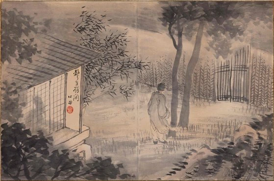 우리의 초가집과는 다른 중국식 초옥 草屋 안에 앉아 책을 읽고 있는 구양수의 모습이 보인다. 주위의 나무는 잎이 모두 떨어져 앙상한 가지만 남아 그 쓸쓸함을 더해 준다. 지금도 여기저기 낙엽이 바람에 나부껴 떨어지고 있다. 김홍도는 이 가을의 쓸쓸함, 차가운 공기와 바람, 거칠고 황량한 나무 등을 효과적으로 표현하기 위해 붓에 먹을 듬뿍 담지 않고 조금만 묻혀 마른 붓질을 활용한 갈필 渴筆 로 이 그림을 완성한다. 천재 화가는 아직 죽지 않았구나. 바싹바싹 타는 듯한 황량함이 그대로 전해진다.