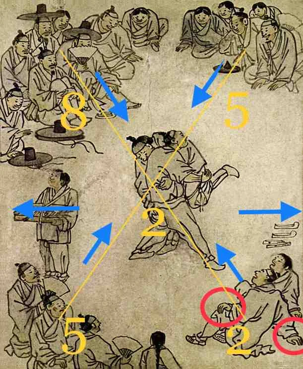 모두들 씨름꾼들에게 시선이 가 있는데, 가운데로 집중되는 시선을 살짝 엿장수가 바깥으로 시선을 돌려놓았다. 엿을 팔아야 하기에 반대로 서야만 하는 엿장수를 통해 단조로울 수 있는 시선을 살짝 틀어 놓았다. 씨름꾼의 벗어 놓은 신발들도 바깥으로 향하고 있다. 몰려 있는 사람의 수도 그림 위쪽이 훨씬 많다. 보통은 안정감을 주기 위해 아래에 더 무겁게 배치하고 멀어지는 위쪽을 서서히 날리는 모양새인데 씨름은 위에 더 많은 사람들을 배치해 역삼각형의 역동적인 구도를 보여준다. 전체가 4그룹으로 나눠져 있는데, 그들의 수가 위 왼쪽부터 시계방향으로 8명, 5명, 2명, 엿장수 포함 5명, 가운데 2명의 씨름꾼이다. 총 22명인데, 한쪽의 대각선이 8명-2명-2명으로 12명, 다른 쪽의 대각선이 5명-2명-5명으로 12명이다. 동, 서양 모두 완벽한 숫자라고 여겨 1일 12시간, 1년 12달로 만든 12라는 숫자를 어느 방향으로 더해도 합이 똑같아지는 마방진 형태로 사람들을 배치하였다. 김홍도가 설마 이것까지 계산해서 그렸다고? 대단하다. 바라보는 시점 또한 전체적으로 위에서 아래를 내려다보는 시점(부감법 俯瞰法)으로 그린 것에 반해, 가운데 씨름꾼은 앉아 있는 구경꾼들이 보는 시점으로 그려 한 그림 안에 다시점을 활용하여 그렸다. 그런데 전혀 어색함이 없다. 이런 대단한 그림을 김홍도는 큰 힘 들이지 않고 스케치하듯이 슥슥- 그렸다고? 김홍도, 천재 맞구나.