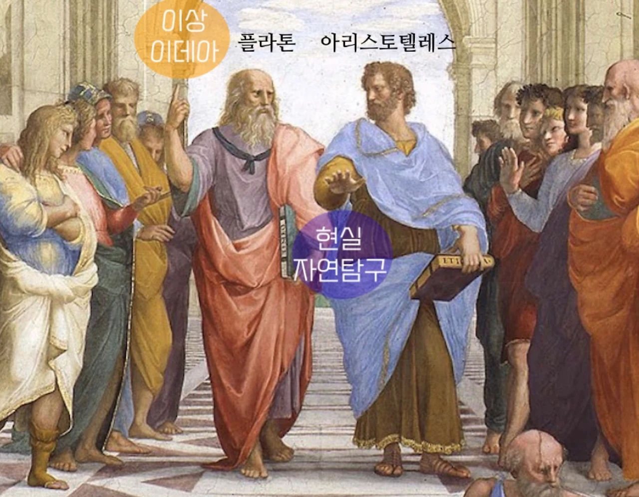 한 손은 하늘을 가리키고 다른 손은 햄록 잔을 집듯이 땅을 가리키고 있는 제스처는 다비드로 인해 소크라테스의 대표적인 포즈로 자리 잡게 된다. 다비드 또한 이 제스처는 고전 작품인 라 파엘로의 ‘아테네 학당’에서 영감을 얻는다. ‘아테네 학당’ 작품의 정중앙에는 서양 철학의 대가인 플라톤이 왼쪽에 그려져 있고, 오른쪽에는 플라톤의 제자인 아리스토텔레스가 그려져 있다. 왼쪽의 플라톤은 하늘을 가리키며 저 위에 있는 이데아 Idea 가 본질이며 현실은 이데아의 그림자 정도라고 말하는 듯 그려져 있고, 오른쪽의 아리스토텔레스는 땅을 가리키며 현실 Realism에서 진리를 찾기 위해 자연탐구를 중시하는 모습으로 그려져 있다. 각자의 왼손에는 그들 철학의 대표적인 서적 중에 하나인 플라톤에게는 ‘티마이오스’가, 아리스토텔레스에게는 ‘윤리학’ 책을 들고 있다. 이 두 철학자 대가의 대표적인 포즈를 소크라테스 하나의 몸짓으로 절묘하게 잔을 잡듯이 전혀 어색하지 않게 스토리 안에 녹여내어 그려 넣었다. 다비드, 정말 그림 하나는 끝내주게 그리는구나!