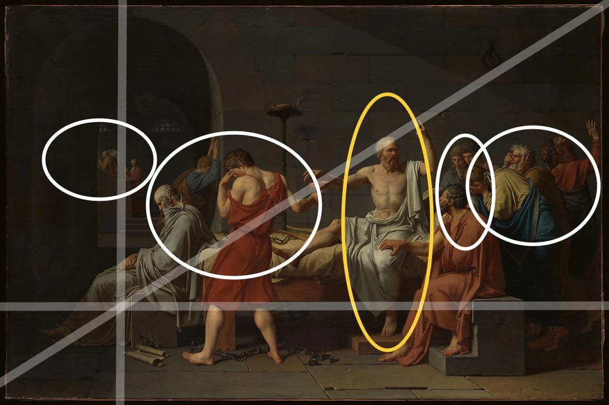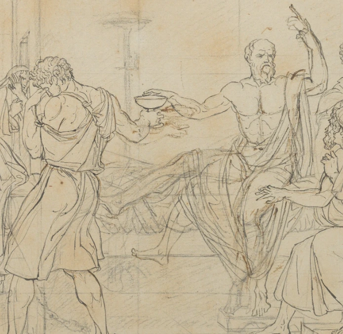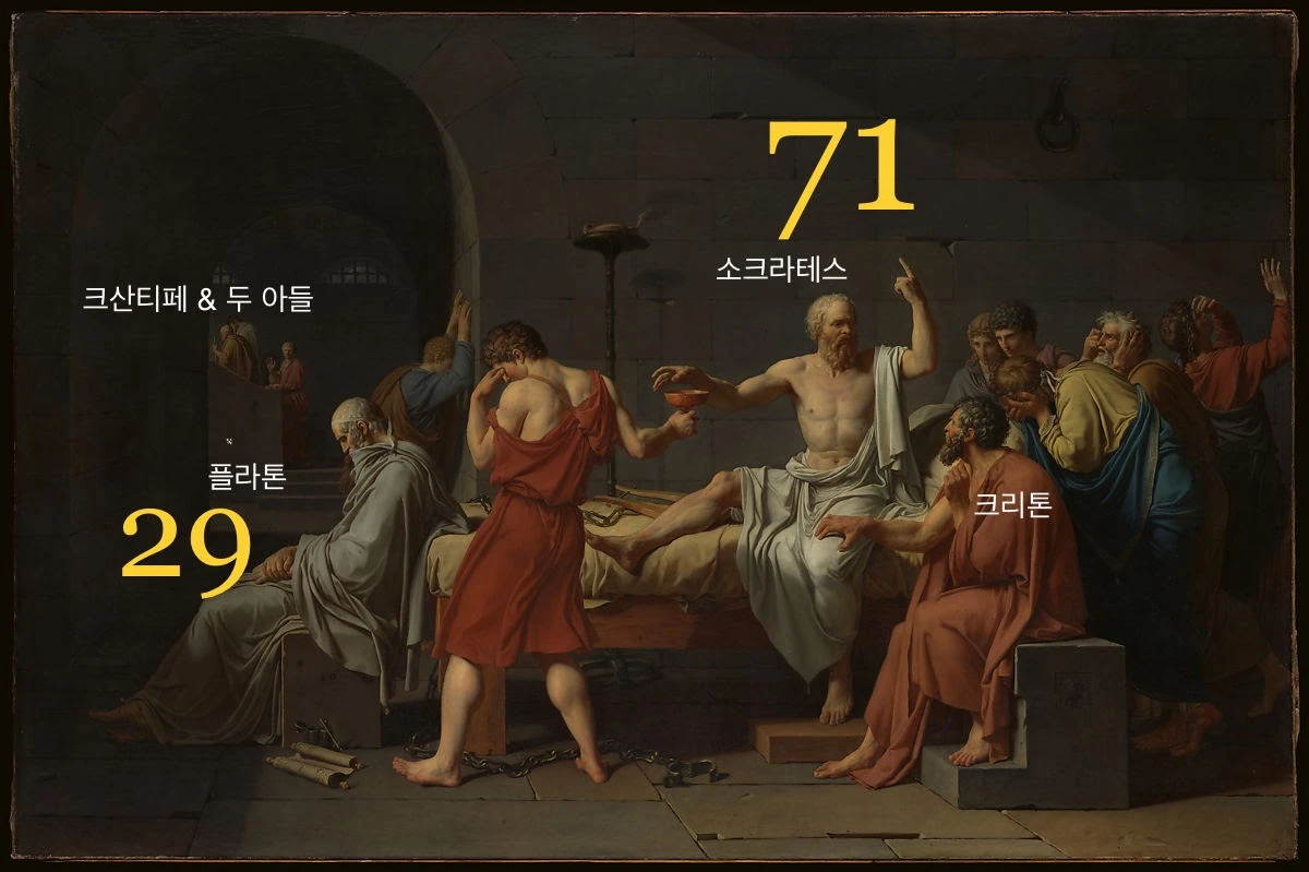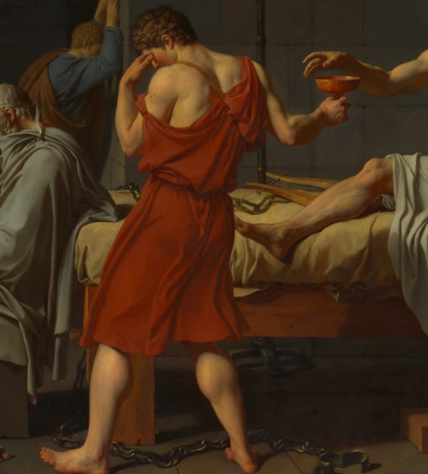 소크라테스에게 독이든 햄록 잔을 건네는 이는 보통 간수가 그 역할을 하는데 이 그림에서는 잔을 건네며 너무 슬퍼하고 있는 것으로 보아 간수가 직접 행하지 않고 간수에게 잔을 전해 받은 그의 제자가 마지못해 건네고 있는 것으로 보기도 한다. 햄록 잔의 붉은색과 잔을 건네는 제자의 붉은색 로브를 맞추어 독이라는 강한 이미지를 그림 전체 안에 전달해 주고 있다. 어마어마한 디테일의 대가이구나!