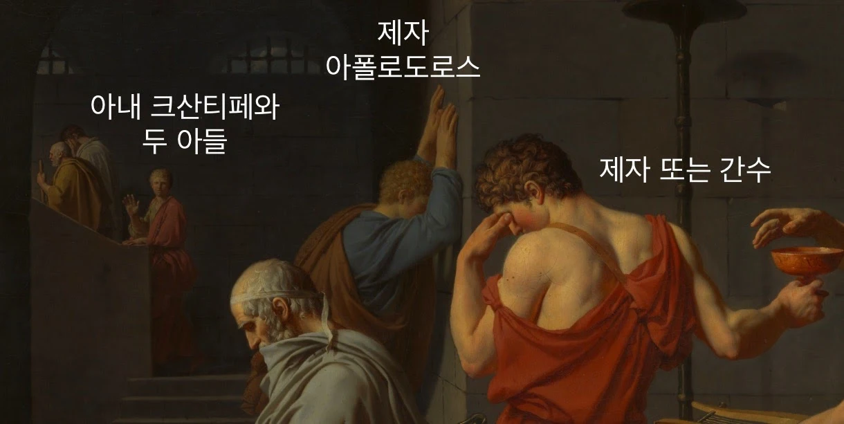 그림의 왼쪽 올라가는 계단에는 소크라테스의 죽음을 차마 보기 힘들었던 그의 아내 크산티페 Xanthippe (악처라고 알려져 있지만, 아니라는 설도)와 두 아들이 빠져나가는 모습이 보이고, 바로 옆 벽에는 슬픔을 참지 못하고 벽을 붙잡고 통곡하고 있는 제자인 아폴로도로스의 모습이 보인다. (플라톤의 책에는 너무 슬픔을 표하여 쫓겨났다고 하는데 다비드의 그림에는 그를 담았다.) 감옥을 빠져나가는 문을 자세히 보니, 미켈란젤로의 ‘아테네 성당’에서의 보이던 배경의 문이 오버랩되어 보인다. 다비드는 르네상스의 세 거장, 레오나르도 다 빈치, 미켈란젤로, 라파엘로를 이렇게 자신의 하나의 그림에 담아냈다.