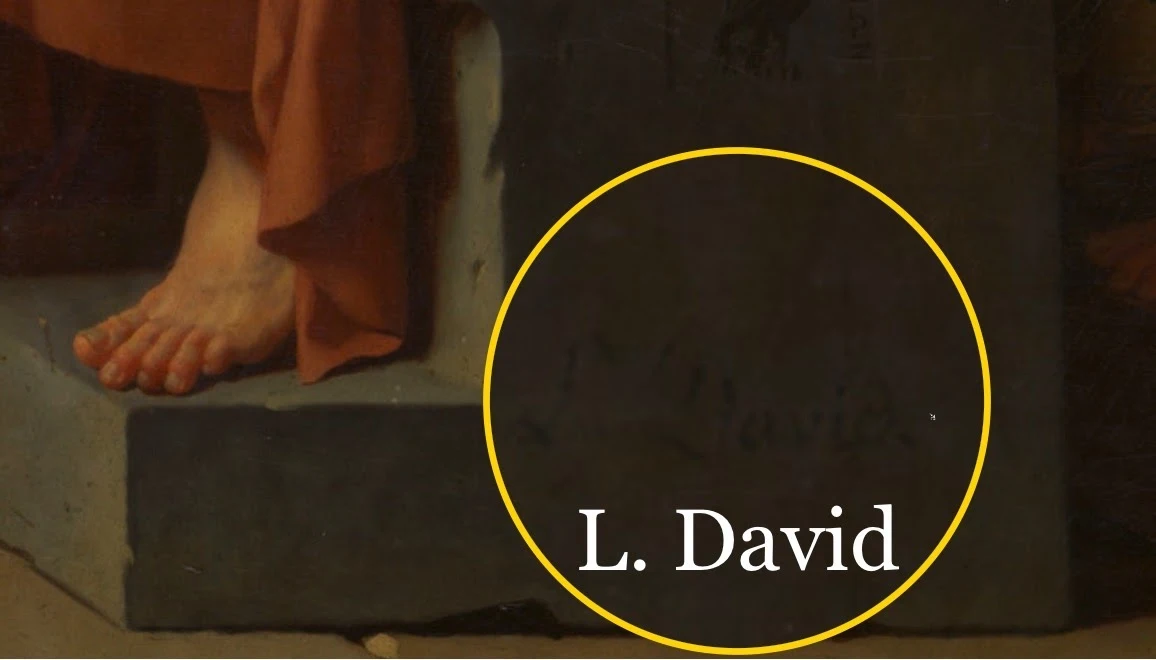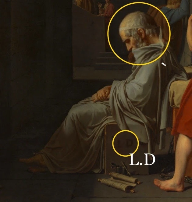 플라톤이 앉아 있는 의자를 자세히 보니 자크 루이 다비드의 이니셜인 ‘L.D’가 그려져 있다. 다비드의 작품에서 자신의 이름 서명은 종종 그가 존경하거나, 그와 동일시되는 인물로 삼고자 할 때, 그 인물의 아래 또는 주위에 그의 이니셜을 새겨 놓곤 한다. 현대의 장 미셀 바스키아의 그림에 있는 ® 표시와 같다고나 할까? 그의 플라톤에 대한 감사와 존경의 마음을 이렇게 자신의 이니셜로 새겨놓은 게 아닐까 본다. 그 바로 앞에는 그가 썼던 저술을 상징하는 글 쓰는 종이와 펜이 널브러져 있다. 이런 것 하나하나까지 다 계산을 해서 그려 넣다니, 참 디테일한 사람이구나, 다비드.