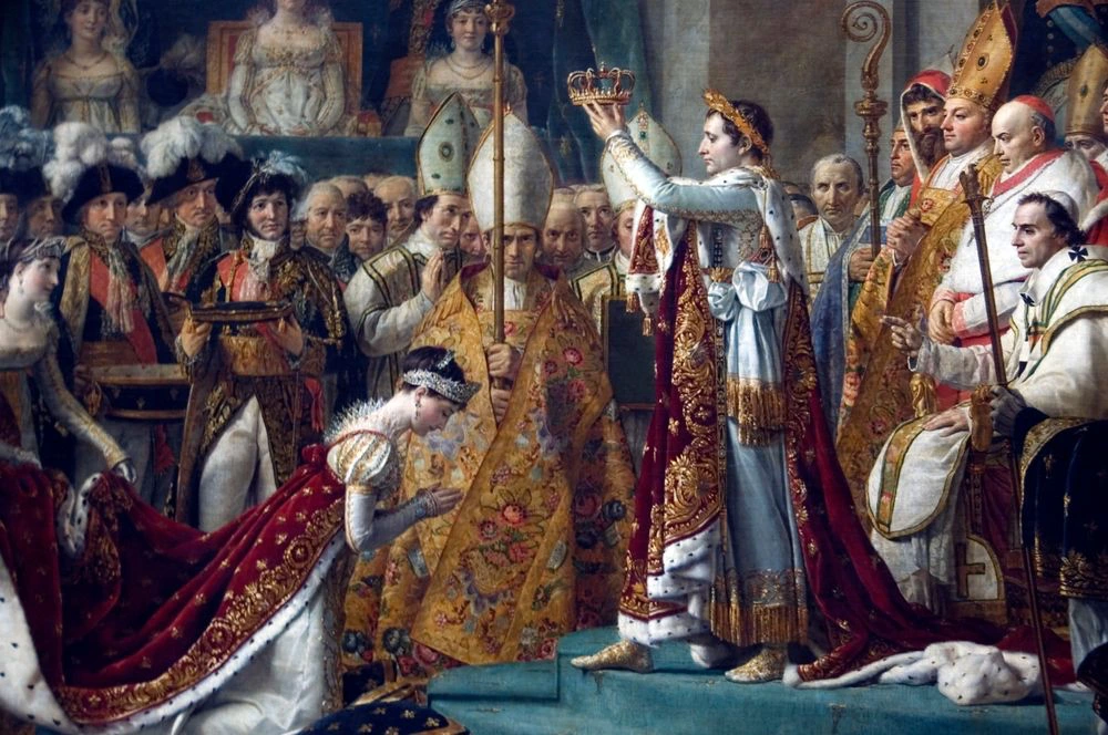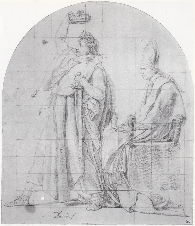 일반적인 대관식에서는 교황이 새로운 왕에게 왕관을 씌워 주는데, 처음 스케치는 (실제 그랬던 것처럼) 직접 나폴레옹 자신이 왕관을 쓰는 것으로 그렸다고 한다. 나폴레옹 자신의 힘은 누구로부터 부여받지 않는 절대 권력이라는 메시지로, 교황을 무능한 모습으로 나폴레옹 뒤에 앉혀 버린다. 너무 했다고 생각했던 걸까? 아니면 교황측의 컴플레인 때문이었을까? 이후에 다비드는 교황과 같은(?) 나폴레옹이 자신의 부인인 조세핀에게 왕관을 하사하는 느낌으로 바꾼다. 이 작품으로 다비드는 나폴레옹으로부터 ‘당신을 존경한다’라는 말을 듣는다. 인정받기 위해서는 다비드처럼 이 정도 왜곡 정도는 해 줘야 하는 걸까?
