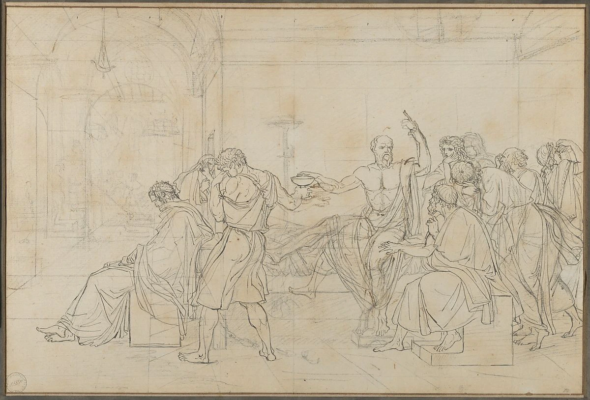두 구도의 닮음이 너무나 놀랍다. 정중앙의 예수 자리에 소크라테스가 놓여 있고, 3명씩 양 옆으로 2그룹씩 총 4그룹으로 구성을 같게 하였다. ‘최후의 만찬’에서 보여지는 한치의 흐트러짐 없이 자도 잰듯한 놀라운 원근감 표현과 안정적인 구도는 ‘소크라테스의 죽음’에서도 그대로 변형하여 보여지고 있다. 전혀 어색함과 부자연스럼 없이 그의 작품 안에 녹여내었다. 그가 얼마나 클래식한 작품에 심취했었는지 여실 없이 보여주는 작품이다. 이 정도면 다비드 또한 천재의 반열에 놓일 수 있지 않을까? 이 작품을 그리기 위해 그가 연구했던 스케치들이 남아 있는데 한 번 볼까?