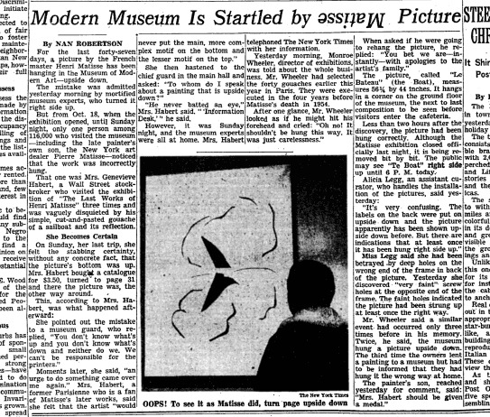 곧바로 전시 카탈로그를 사서 확인해 보니 거꾸로 걸린 게 맞았다. 가까운 경비원에게 말했더니 누가 알겠냐는 식으로 말해서 그녀는 짜증이 났고, 데려간 안내 데스크는 일요일이라 문이 닫혀 있었다고 한다. 뉴욕 타임스에 연락한 그녀로 인해 1961년 12월 5일 대문짝만 하게 기사가 나게 된다. 기사의 제목이 ‘모마 미술관은 마티스의 작품에 의해 깜짝 놀라게 되다’인데 센스 있게 마티스 Matisse라는 단어를 거꾸로 써 놓았다. 결국 뉴욕 타임스가 아트 디렉터인 먼로 휠러에게 연락한 지 2시간 만에 제대로 걸게 된다. 더 놀라운 건 그것을 거꾸로 걸었던 어시스턴트 큐레어터인 앨리샤 렉의 실수뿐만 아니라, 작품 앞에 붙은 라벨도 거꾸로 붙여져 있었고 심지어 그 전에도 거꾸로 걸렸던 것처럼 나사 구멍이 나 있었다는 것이다. 그럼, 얼마나 오랫동안 거꾸로 걸려서 전시가 되었던 거야?