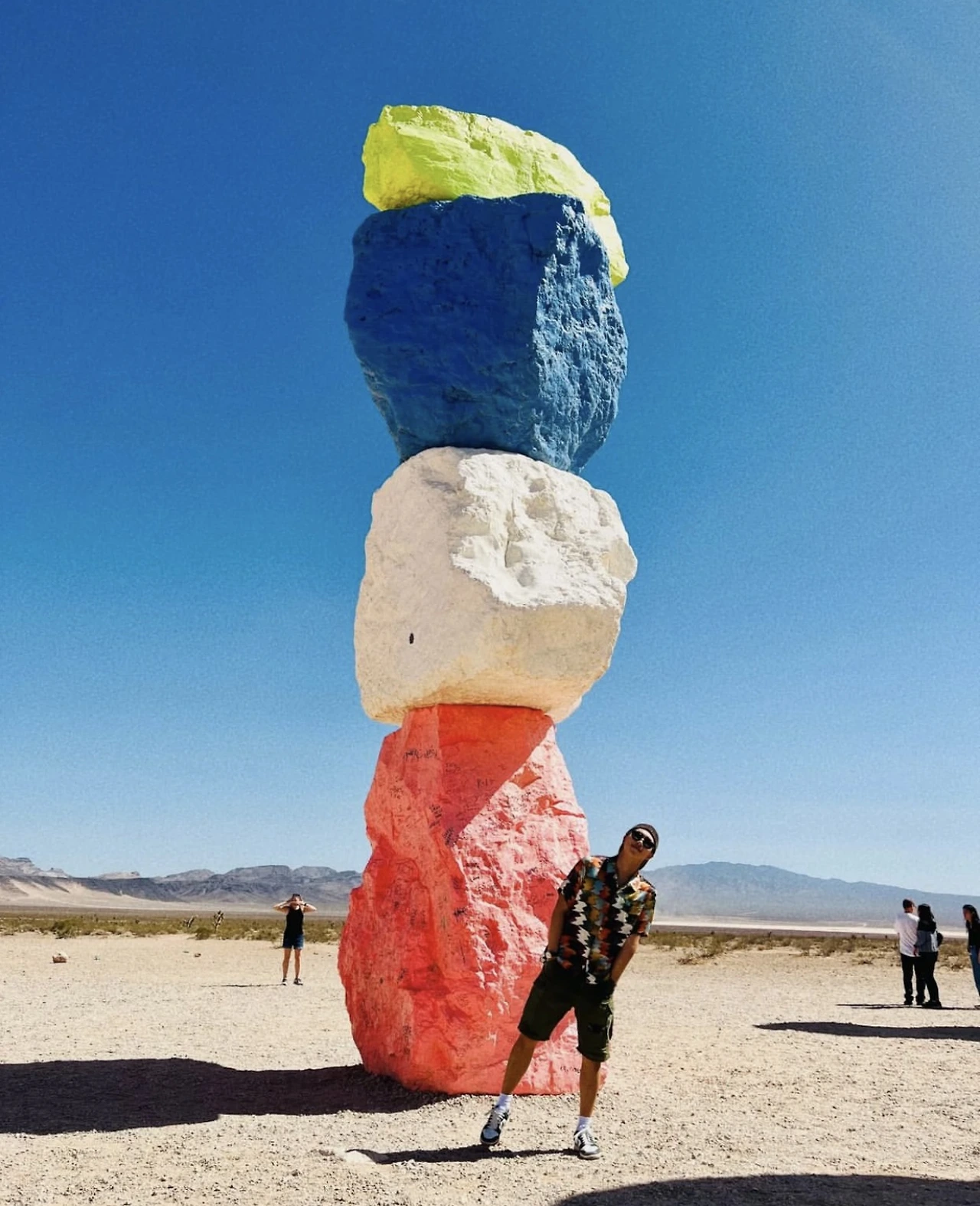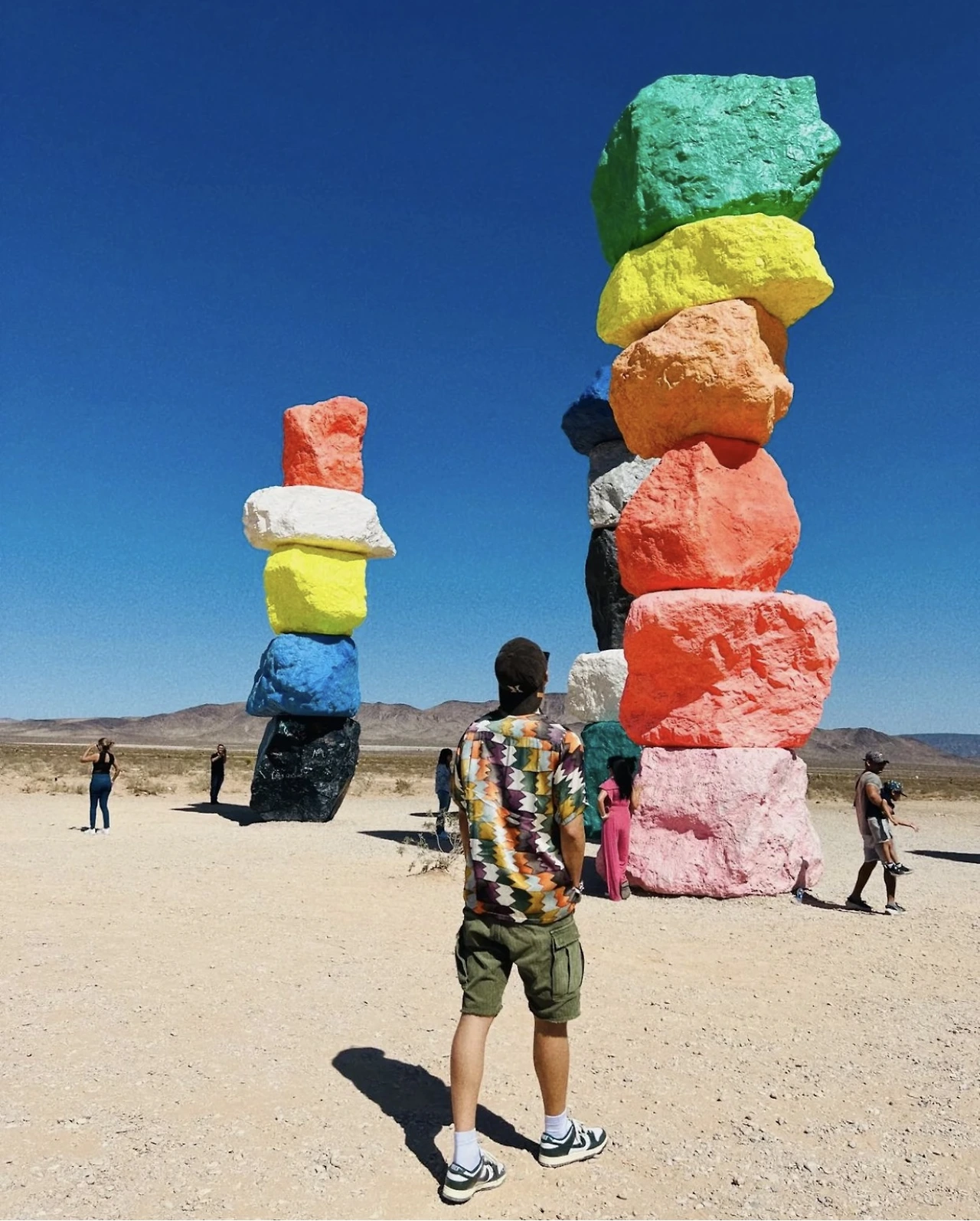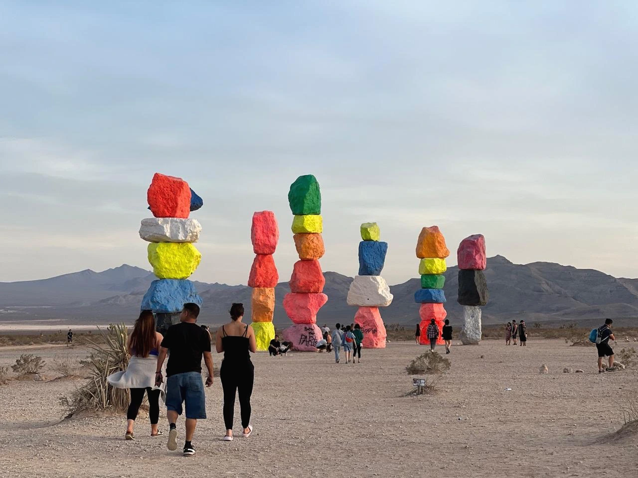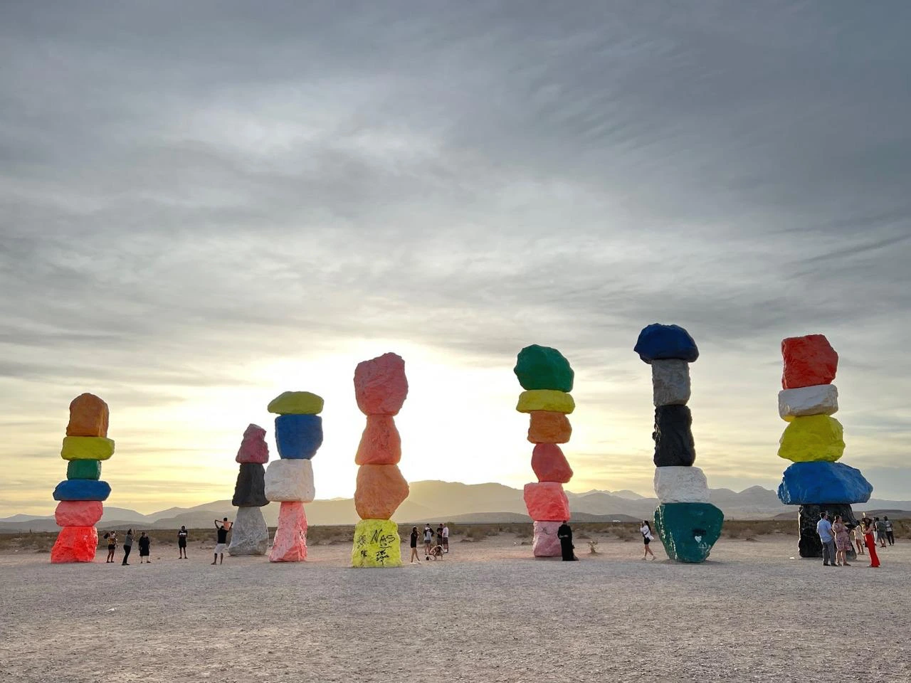 눈에 들어오는 문구가 ‘사막’과 ‘도시 불빛’이다. 아, 론디노네는 가장 자연적인 모습인 사막에 가장 인공적인 형태인 ‘도시 불빛’을 이렇게 보여주고자 했구나! 이 삭막한 사막의 땅에 세워진 화려한 도시인 라스베가스 Las Vegas 가 그랬던 것처럼 말이다. 어울릴 것 같지 않은 두 요소인 자연 사막과 인공 도시가 한 공간에 이런 모습으로 보여지고 있다. 그래서 색도 라스베가스의 화려한 네온 사인처럼 가장 인공적인 네온 컬러인 형광색의 빨강, 노랑, 파랑, 실버 등으로 바위를 칠했구나 싶다. 무지개색인 7개 컬러에 흰색, 검정 그리고 실버로 총 10가지 색으로 꾸며져 있다. 총 33개의 큰 바위들이 작게는 4개, 많게는 6개까지 층을 쌓아 낮은 건 약 9m, 높은 건 약 11m까지 거대한 탑처럼 7줄로 제각각 놓여져 있다. 가까이 다가가니 그 거대함이 충분히 산이라 부를 만하다. 이 삭막한 사막에 이런 거대한 색색의 컬러 바위들이 놓여있을 리가 없잖아? 론디노네는 그것을 매직이라 부른다. 이 허허벌판 사막에 이런 거대한 돌덩어리를 옮겨놓고 색을 칠해 산처럼 만들어 놓은 것 자체가 매직이라 할 만하다. 우리가 상상하지 못하는 미술로 마술을 부려 놓았다. 작품으로 걸어갈수록 점점 커 보이는 바위들이 설렘 뿜 뿜이다. 도착했을 때 그 거대함 뿐만 아니라 컬러의 아름다움에 입이 다물어지지 않는다. 여기저기 사진 찍는 이들의 얼굴에는 즐거움 가득이다. 웃는 얼굴과 그들의 웃음소리가 끊이지 않는다. 문득, 론디노네가 부리고자 했던 매직이 이런 게 아닐까 싶다. 여기 오는 모든 이들에게 웃음과 행복감을 주는 그런 매직, 나도 어느새 매직에 걸려 버렸다.