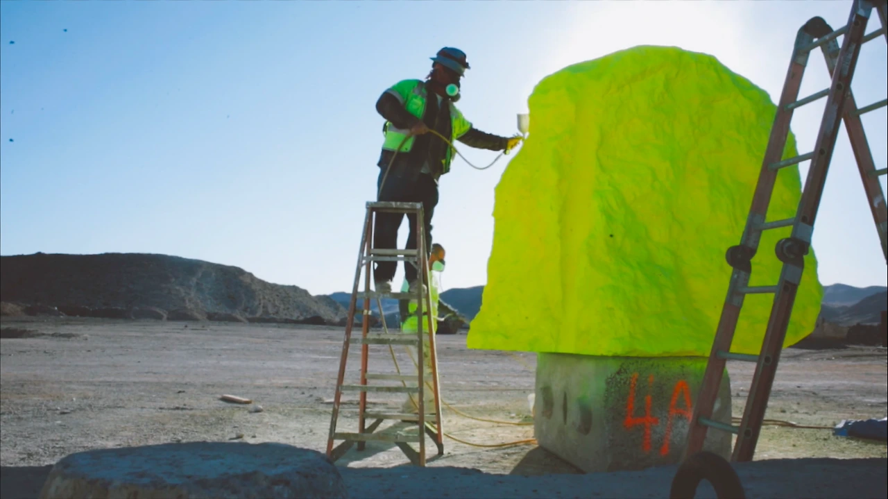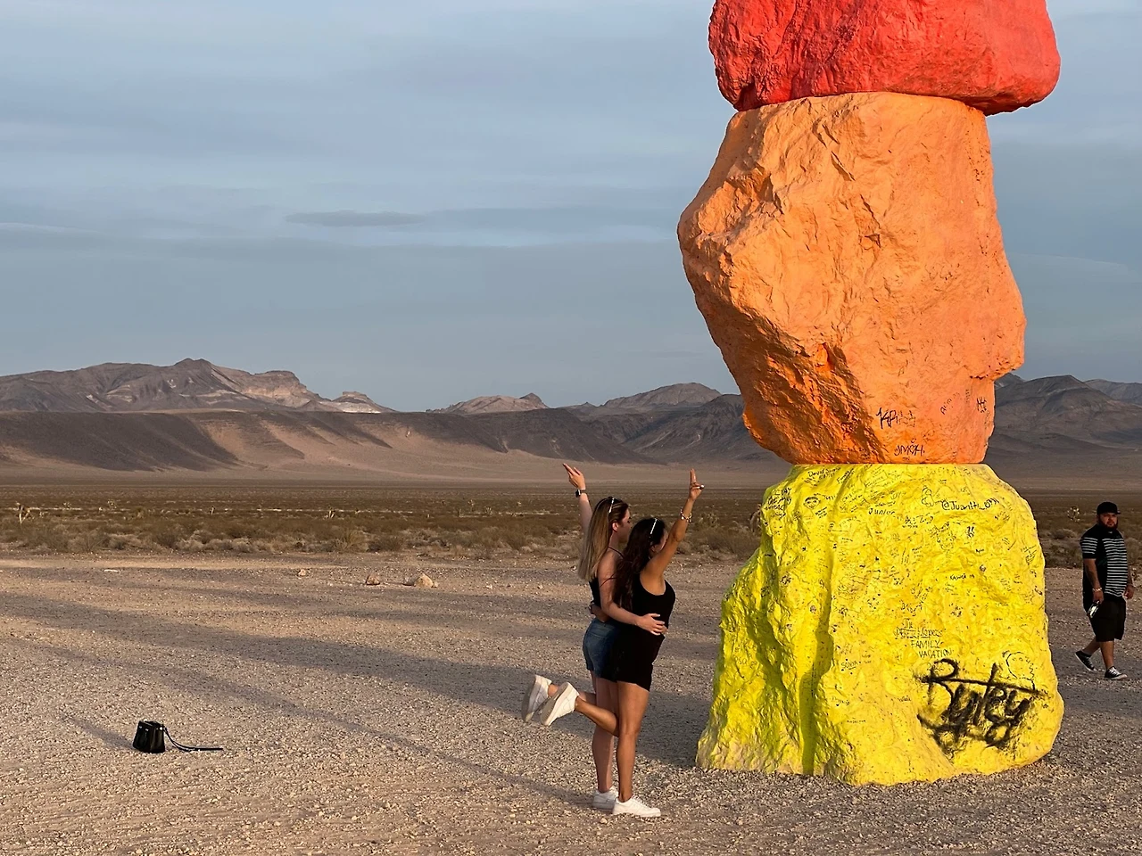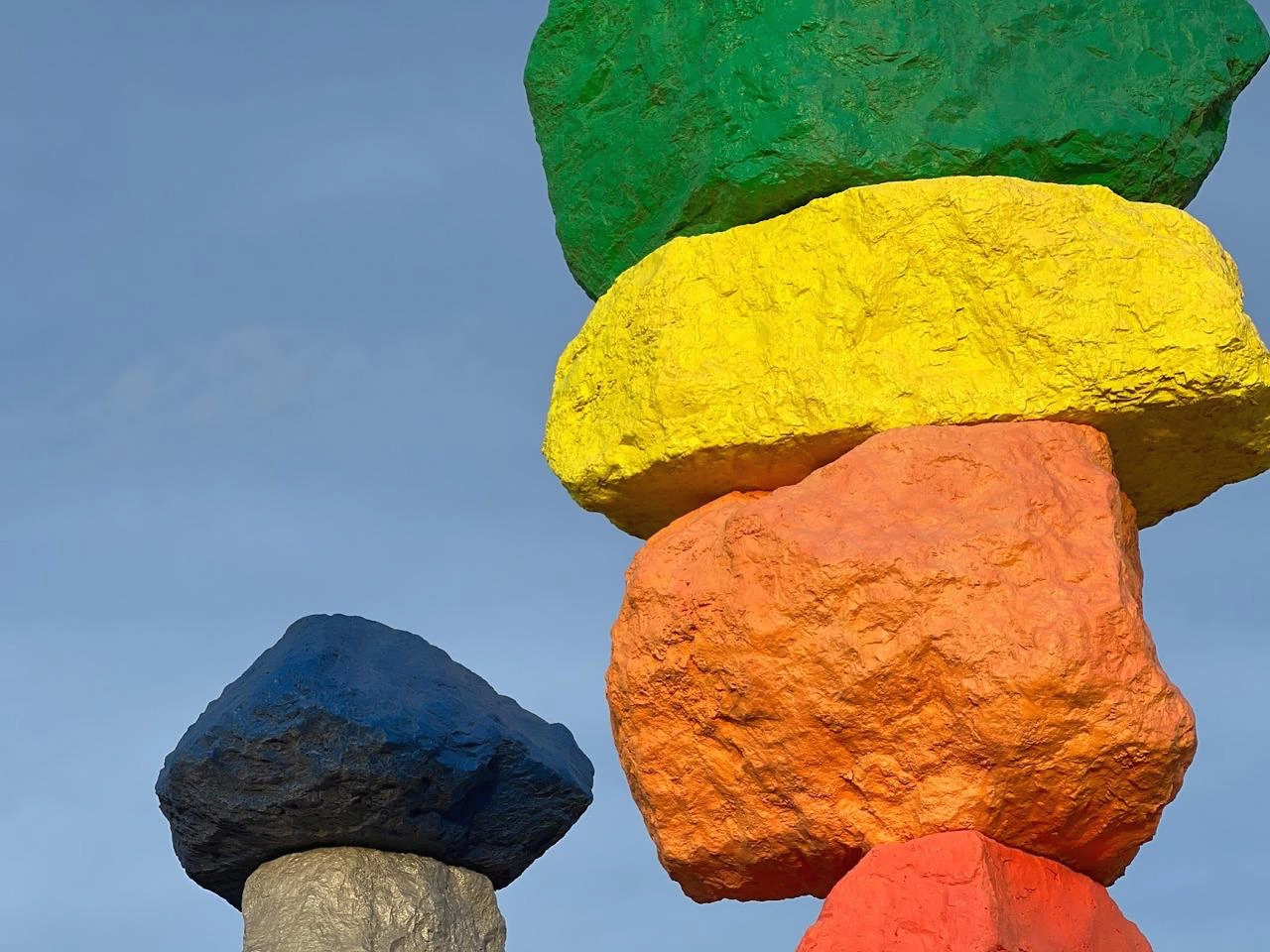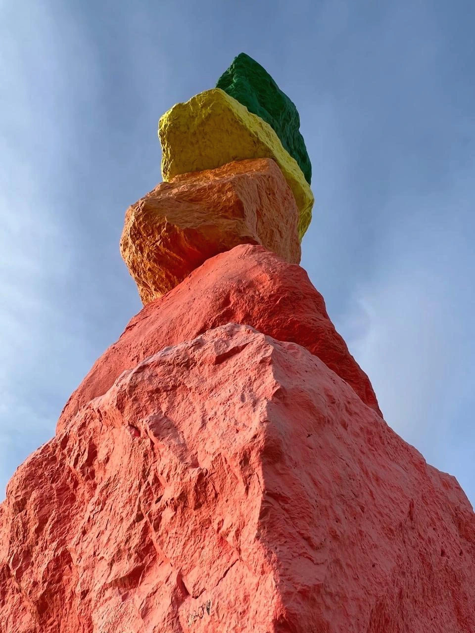 눈에 들어오는 문구가 ‘사막’과 ‘도시 불빛’이다. 아, 론디노네는 가장 자연적인 모습인 사막에 가장 인공적인 형태인 ‘도시 불빛’을 이렇게 보여주고자 했구나! 이 삭막한 사막의 땅에 세워진 화려한 도시인 라스베가스 Las Vegas 가 그랬던 것처럼 말이다. 어울릴 것 같지 않은 두 요소인 자연 사막과 인공 도시가 한 공간에 이런 모습으로 보여지고 있다. 그래서 색도 라스베가스의 화려한 네온 사인처럼 가장 인공적인 네온 컬러인 형광색의 빨강, 노랑, 파랑, 실버 등으로 바위를 칠했구나 싶다. 무지개색인 7개 컬러에 흰색, 검정 그리고 실버로 총 10가지 색으로 꾸며져 있다. 총 33개의 큰 바위들이 작게는 4개, 많게는 6개까지 층을 쌓아 낮은 건 약 9m, 높은 건 약 11m까지 거대한 탑처럼 7줄로 제각각 놓여져 있다. 가까이 다가가니 그 거대함이 충분히 산이라 부를 만하다. 이 삭막한 사막에 이런 거대한 색색의 컬러 바위들이 놓여있을 리가 없잖아? 론디노네는 그것을 매직이라 부른다. 이 허허벌판 사막에 이런 거대한 돌덩어리를 옮겨놓고 색을 칠해 산처럼 만들어 놓은 것 자체가 매직이라 할 만하다. 우리가 상상하지 못하는 미술로 마술을 부려 놓았다. 작품으로 걸어갈수록 점점 커 보이는 바위들이 설렘 뿜 뿜이다. 도착했을 때 그 거대함 뿐만 아니라 컬러의 아름다움에 입이 다물어지지 않는다. 여기저기 사진 찍는 이들의 얼굴에는 즐거움 가득이다. 웃는 얼굴과 그들의 웃음소리가 끊이지 않는다. 문득, 론디노네가 부리고자 했던 매직이 이런 게 아닐까 싶다. 여기 오는 모든 이들에게 웃음과 행복감을 주는 그런 매직, 나도 어느새 매직에 걸려 버렸다.