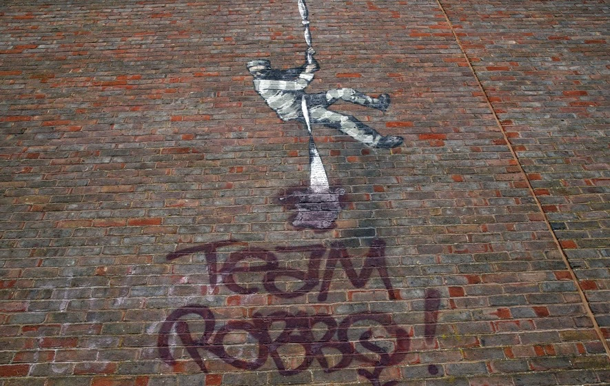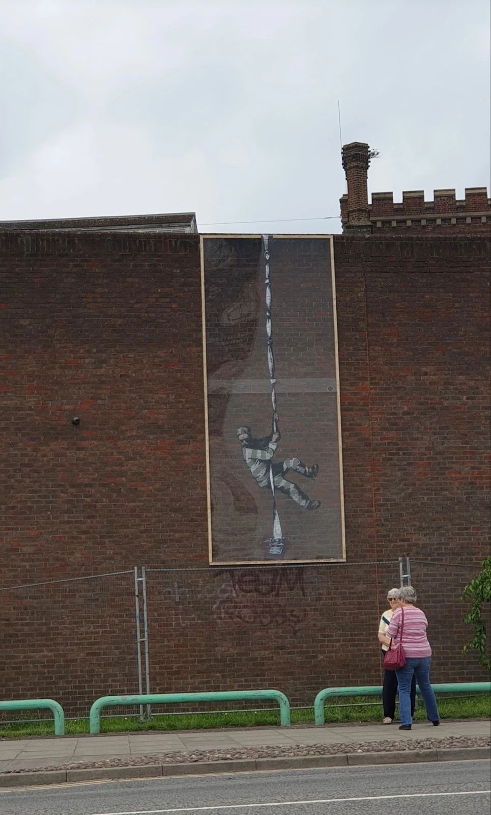 정식 명칭은 ‘HM Prison Reading’ 인데 주로 ‘레딩 제일(Jail) Reading Gaol’ 로 많이 불려지고 있는 교도소로 레딩 수도원이 있던 이 자리에 1844년 버크셔 카운티 감옥으로 세워졌다. 1845년에는 만여명의 군중 앞에서 공개 처형이 이루어지기도 하였고, 1868년부터 내부 사형집행으로 바뀌고, 1913년 마지막 사형 집행이 이루어졌었던 곳이기도 하다. 2013년 9월 폐쇄 발표를 하고 다음해 2014년에 폐쇄된 후에는 극장 등 문화, 예술의 공간으로 활용하자는 목소리가 높았다. 그 일환으로 2016년 6월 레딩 문화의 해 프로그램을 위한 예술 공연장 전시회로 수만명의 사람들이 찾았다. 2019년 10월 법무부가 부지 매각을 발표하고 아티잔 부동산 Artisan Real Estate 회사가 낙찰받았지만 2020년 11월 매각이 무산되고 다시 새 주인을 찾아야 했다. 2021년 3월 대규모의 ‘감옥 행진 March to the Gaol’ 이 예정되었으나 코로나로 취소되었던 그 시점에 뱅크시는 뭔가 이 공간을 문화, 예술의 공간으로 세상에 이슈를 만들어야겠다 생각한 게 아닐까? 어찌되었든, 온 세상에 이 그래피티가 알려지고 옛 레딩 교도소도 알게 되면서 확실히 이슈만들기에 성공한다.