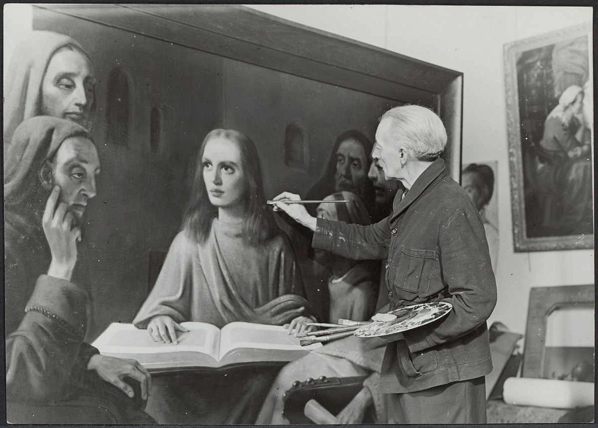 알고 봐서 그런가? 그렇게 베르메르의 작품이라고 보기는 쉽지 않은데? 선입견인가? 표현된 얼굴들도 조금 엉성하고, 이전의 베르메르 작품 속의 감탄이 나올 정도의 얼굴 표정이 아닌데? 아무튼, 이 그림을 들고 베르메르의 전문가라고 알려진 아브라함 브리데우스 Abraham Bredius에게 보여주는데 브리데우스는 베르메르가 주로 쓰던 백색 납을 분석하고, 엑스레이도 찍어보며, 착색 물질의 미세분광법까지 쓰며 조사한 끝에, ‘델프트 베르메르의 걸작 the masterpiece of Johannes Vermeer of Delft’ 발표한다. 그때부터 메이헤런은 날개를 단다. 이 ‘엠마우스에서의 만찬’ 그림은 램브란드 소사이어티에 지금으로 계산하면 €4,640,000 (약 70억 원)에 팔린다. 그 이후 메이헤런은 베르메르의 많은 작품들을 그려낸다. 그가 그리고 베르메르 작품이라고 하면 의심의 여지없이 팔려 나갔다. 메이헤런은 그림을 판 돈으로 호화로운 생활을 하다 뜻하지 않은 일로 꼬리가 잡힌다. 1942년 2차 세계대전 때, 나치가 네덜란드를 점령하던 시기에 나치의 헤르만 괴링이 메이헤런이 그린 또 다른 베르메르의 위작 ‘간음과 여인과 함께한 그리스도 Christ with the Adulteress’을 포함한 약 6,750여 개의 작품을 오스트리아 소금광산에 보관하고 있었는데 1945년 전쟁이 끝난 후 네덜란드는 이 그림을 발견하고 메이헤런이 나치에 부역하여 네덜란드의 문화재를 넘겨준 게 아니냐는 협의로 1945년 5월 29일 메이헤런을 체포한다. 문화재 약탈자로 사형의 위협을 받은 메이헤런은 여기서 뜻밖의 고백을 한다. 사실 괴링의 손에 있던 이 그림은 가짜라고. 내가 이 그림을 그렸노라고. 그러니 베르메르의 진품이 아니니 나는 죄가 없다고. 여기서 또 진풍경이 벌어진다. 믿지 못한 법원은 기자들과 법원이 임명한 증인들 앞에서 메이헤런이 직접 베르메르의 작품을 위조한 수법으로 똑같이 그려보라고 한다. 증인들 앞에서 정교하게 그려가는 메이헤런의 솜씨에 모두들 깜짝 놀란다. 여론은 그를 ‘나치를 속인 국민 영웅’ 분위기로 바뀌고 1947년 11월 징역 1년이 선고된다. 항소를 준비하던 메이헤런은 1947년 12월 30일 몇 번의 심장마비 증세로 그의 나이 58세에 죽게 된다.