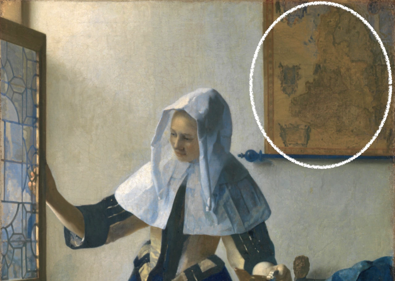 이 시기가 네덜란드의 해상력으로 전 세계를 항해하면서 무역으로 가장 부흥했던 네덜란드 골든 에이지 Dutch Golden Age 시대 이다보니, 세계 지도가 각 집집마다 장식품으로 벽에 많이 걸려 있었다고 한다. 새롭게 업데이트된 지도들이 속속 나오면서 더 크고 더 최신의 지도가 그 가문의 번영, 부의 상징처럼 유행하듯이 많이 걸었다고 한다. 그 당시 유행의 흔적이 베르메르의 작품에서도 많이 보인다. 테이블을 덮고 있는 양탄자 덮개의 문양 또한 아시아에서 가져온 듯한 패턴이다.