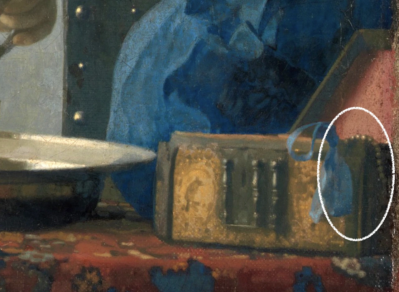 ‘진주 귀걸이를 한 소녀’ 처럼 베르메르의 작품 속 많은 소녀, 여인들은 진주 귀걸이 또는 진주 목걸이 모양의 장식을 많이들 하고 있다. 베르메르 여인의 시그니처 같은 요소이다. 그 둥근 진주가 빛에 반짝이고 머금고 있는 광택을 표현하는데 감탄이 절로 나온다. 작품 속 여인이 진주 액세서리를 하고 있지 않다면? 그럼 그 주위 어딘가에 있지 않은지 찾아보는 재미도 쏠쏠하다. 탁자 위에 무심코 널브러져 있을 수도 있고, 박스에 살짝 나와 있을 수도 있다. 물주전자- 그림에는 어디에 있지? 오른쪽 아래 탁자 위에 보석함 박스에 살짝 비집고 나와 있는 진주 목걸이? 찾았는지?