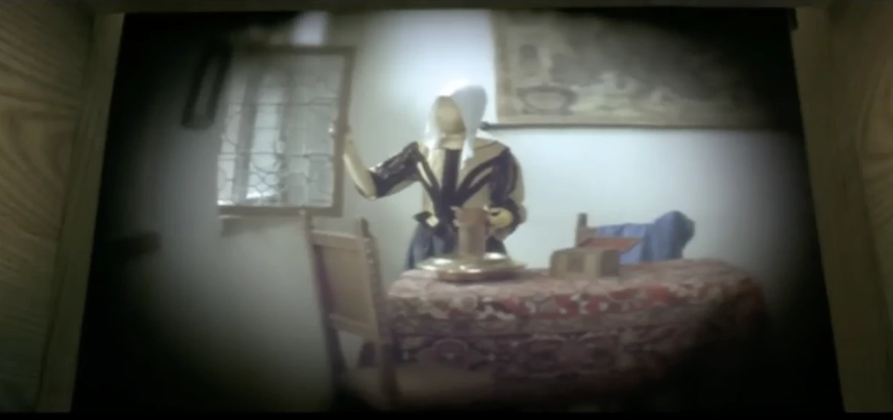 둘째, 그림의 이미지를 보는 각도이다. 물주전자- 소녀의 그림을 예로 들면, 여인을 바라보는 각도가 살짝 아래에서 위를 올려다보는 각도이다. 이 각도는 앉아서 카메라 옵스큐라를 통해 들어온 이미지를 따야 하는 그 각도라는 것이다. 많은 베르메르의 그림들이 이 각도에서 여인을 바라보는 그림들이 많다.