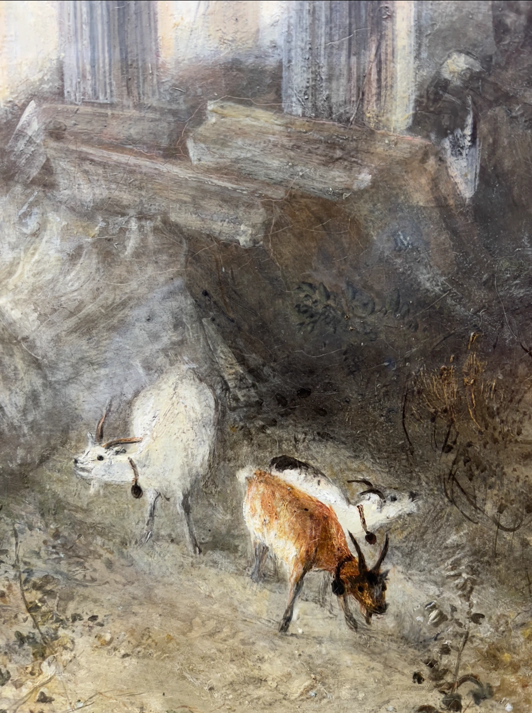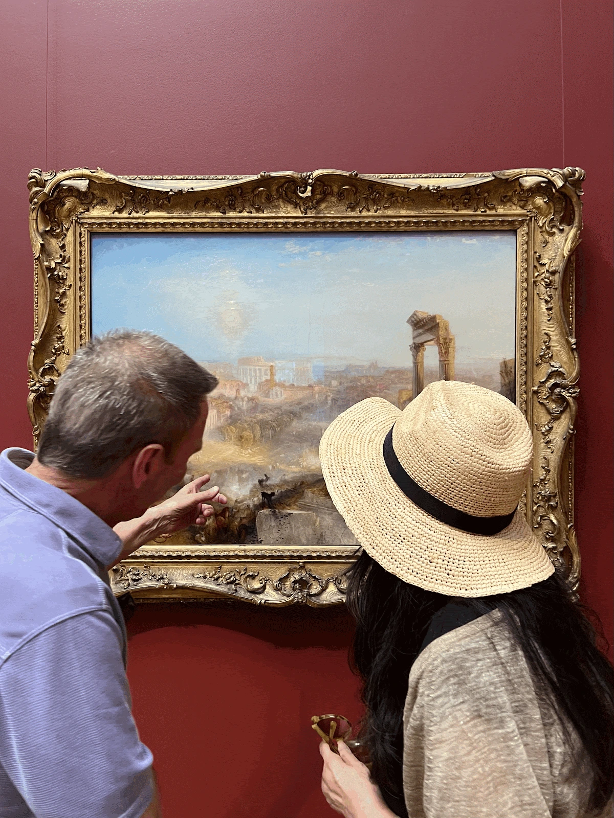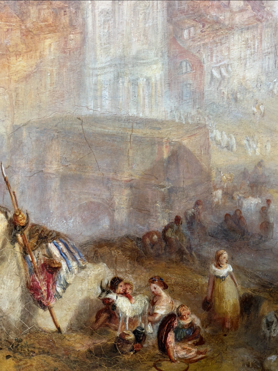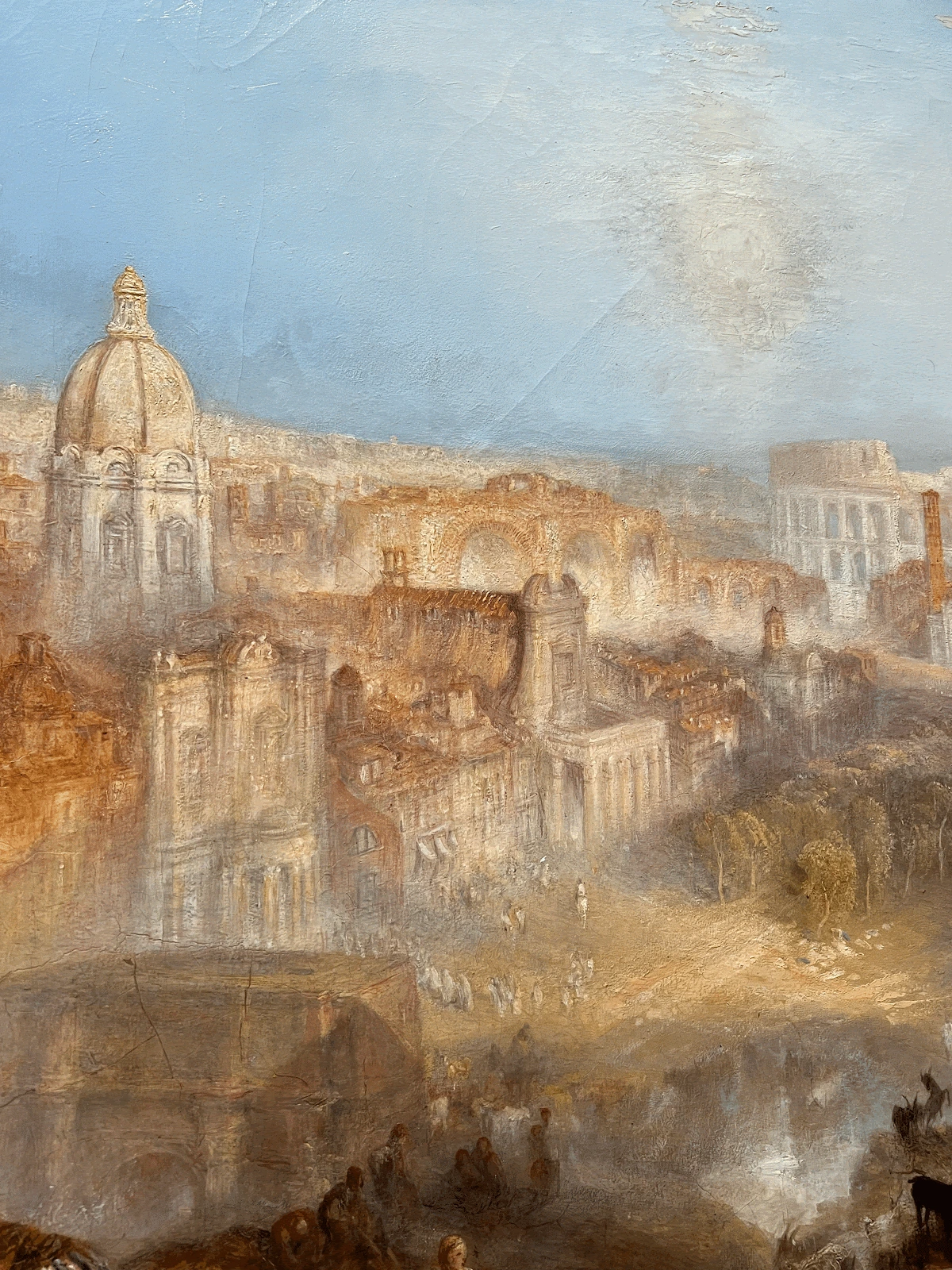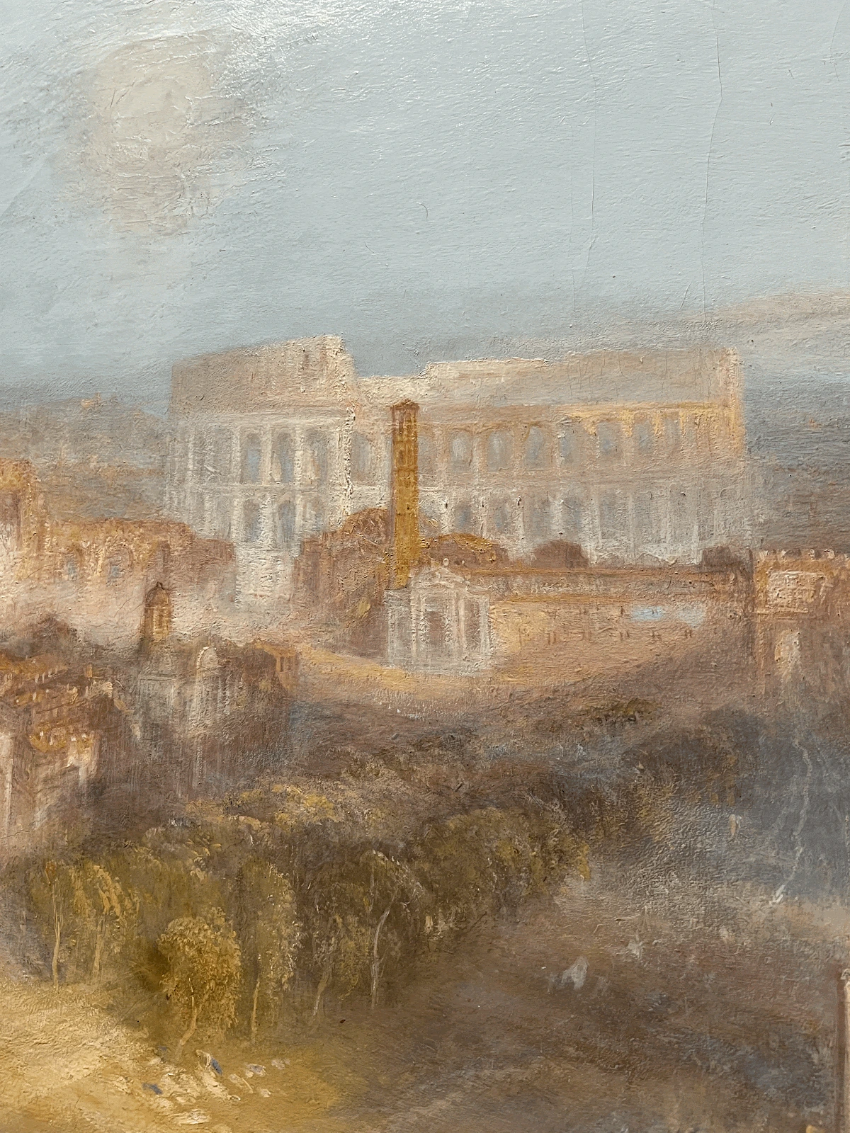 ‘캄포 바치노 Campo Vaccino’ 는 로마의 중심가 지명 이름인데 ‘소 목초지 Cow Pasture’ 라는 뜻으로 지금의 포로 로마노 Foro Romano (Roman Forum)이다. 그래서 오른쪽 아래에 너무나 귀여운 염소들을 그려 넣은 걸까? 왼쪽 아래에 평범한 로마인들이 가축들과 어우러져 그들의 평화로운 일상을 즐기고 있는 모습이 사랑스럽다. 모던 로마, 로마 제국의 오랜 역사와 숨결을 느낄 수 있는 건축물과 그 역사와 더불어 현대에 살고 있는 로마인들의 모습을 함께 어우러져 담아냈다. 선셋에 물든 로마 시내의 멋진 풍광을 매혹적인 색상으로 표현하였다. 하늘 위 살짝 왼쪽에 이제 막 떠오르는 하얀 달이 보인다. 정말 건축물 표현이 예사롭지 않다. 정 가운데 콜로세움 Colosseum 이 ‘나, 여기 로마요~’ 하고 얘기하는 듯하고, 왼쪽의 바로크 양식의 산티 루카 이 마티나 Santi Luca e Martina 성당이 로마 카톨릭의 위엄을 느끼게 해 준다. 건축물 표현 하나하나가 대단히 선명하고 매혹적하다. 전체적으로 내가 직접 언덕에 올라 뷰포인트에서 로마 시내를 한눈에 바라보고 있는 듯하다. 그런데 이 그림이 더 놀라운 건, 터너가 로마를 두 번 여행하였는데 그 두 번째 여행 후, 10년 후에 그때의 기억을 되살려 그린 작품이라고 한다. 이렇게 생생하게 기억에서 끄집어내어 그린다고? 현장에서 스케치를 해서 완성하였다고 보여지지만, 그렇다 치더라도 너무나 생생한 표현이다. 화가는 기억을 찰칵! 이미지로 저장한다고 하던데 정말 그런 걸까? 놀라울 뿐이다.