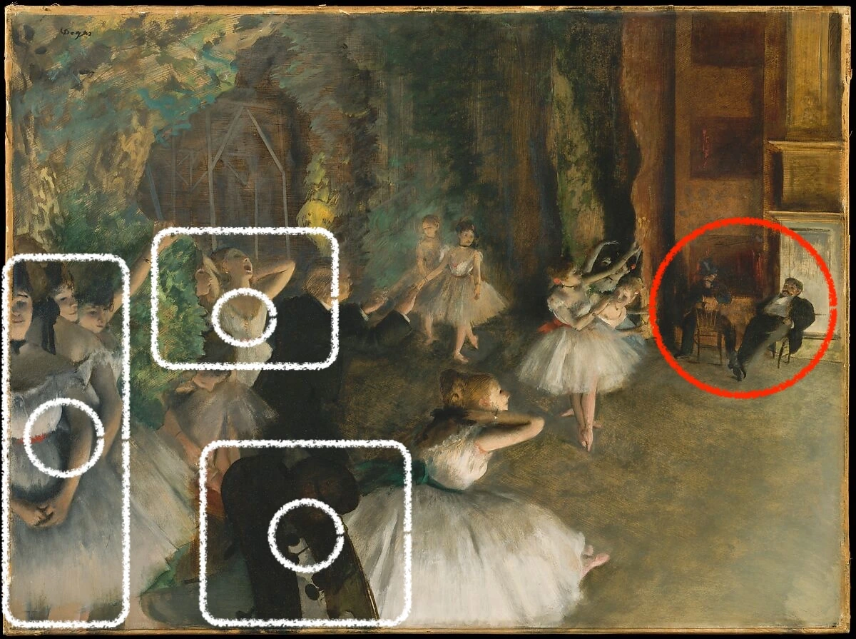 와, 이 작품도 메트로폴리탄에 있었네! 이 작품은 전체를 유화로만 그린 것을 보이지만 자세히 보시면 파스텔로 흐뿌려져 그려진 것도 보이고 수채화도 사용한 혼합 재료로 그려진 것이 독특하다. 아, 14세 리틀 댄서에서도 왁스 조각상, 실크 머리띠, 투투 천 등 혼합 재료를 썼는데 이러한 시도를 그림에서도 했었구나! 혁신 적이네. 나는 왜 이 그림에서 오른쪽에 앉아 있는 두 남자가 먼저 보이지? 검은 정장을 입고 한 남자는 주머니에 손을 넣은 채 다리를 쭈욱 뻗어서 앉아 있고, 다른 남자는 의자 등받이를 앞으로 돌려 팔을 올리고 편하게 발레 리허설을 지켜보고 있다. 아니, 발레 하는 소녀들을 보고 있는 거겠지. 이 남자들이 아보네 abonnés 라고 하여 가난한 댄서들에게 돈을 대고 즐기려는 스폰서이다. 이 당시 파리에서 오페라 후원자 남성들은 이렇게 리허설에 들어와서 댄서들을 볼 수가 있고, 공연이 끝날 때까지 기다렸다가 에스코트해서 같이 나갈 수 있도록 접근할 수 있는 권한이 있었다고 한다. 그걸 이렇게 표현해 놓았다. 그런데 그 당시에도 이러한 그림은 불편했나 보다. 이미지의 부적절성 때문에 이 그림이 일러스트레이티드 런던 뉴스 Illustrated London News 에 거부되었던 일화가 있었다고 한다. 지금 봐도 음흉하네.