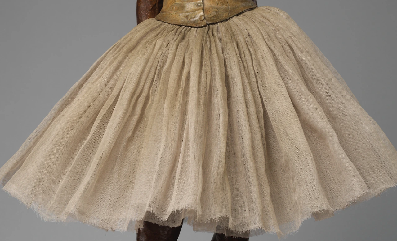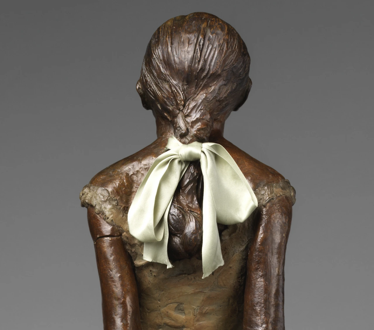 조각상에 왁스로 함께 포함하지 않고 따로 준비한 머리띠와 투투 Tutu 는 너무나 센스 있다. 과하지 않고 적당히 포인트만 준 거 같아 부담이 없다. 절제미까지 느껴진다. 여기에서 상의 옷까지 옷감으로 처리했다면? 노노, 그건 너무 과하지. 실크 머리띠도 일상에서 그냥 쓰는 머리띠 같아 친근해서 좋고, 투투 스커트도 연습용처럼 편해 보이고 자연스럽다. 여기서 잠깐 드는 생각이, 저것들은 패브릭이라 시간이 지나면 변하고 삭지 않나? 찾아보니, 안 그래도 이 패브릭은 처음 오리지널이 아니라, 왁스에서 청동으로 변하기까지 따로 제작하여 꾸민 것이라 한다. 지금 우리가 메트로폴리탄에서 보고 있는 투투는 2018년에 드가의 의도를 고려하여 색상을 맞추고 재단하여 제작한 스커트라고 한다. 시대에 따라 바뀐 머리띠와 투투 보내 재미도 있네.