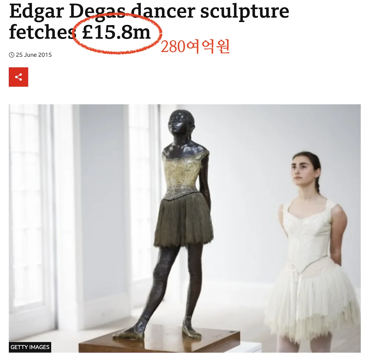 평생 결혼하지 않고 혼자 살았던 드가는 1917년 세상을 떠난 후 자식이 없었기 때문에 상속인으로는 남동생인 르네 드가 René De Gas 와 죽은 여동생 마거리트 Marguerite 의 네 자녀가 된다. 이 상속인들은 후에 드가의 스튜디오에 깨지고 미완성된 채로 널브러져 있던 약 150여 점의 왁스 조각품 중에 72개를 살려 청동으로 주조할 것을 결정하고 에브라르 Hébrard 주조소에 맡긴다. 사실 미국인 컬렉터 헤브마이어 부인이 드가가 살아있을 때인 1903년 드가의 스튜디오에서 14세 리틀 댄서 왁스 조각상을 보고 사고 싶다고 전하는데 드가는 청동상 또는 캐스트로 만들어 다시 팔겠다는 뜻을 보이게 되는데 그 드가의 뜻을 살려 청동 주조키로 한다. 각 조각품당 총 20개씩 한정 에디션에 한 세트는 상속인, 한 세트는 에브라르 주조소의 것으로 더하여 총 22개 에디션으로 72세트를 주조한다. 우리가 여행 다니면서 여기저기 미술관에서, ‘어 , 드가의 조각상이 여기도 있네? 저번 여행에서 갔던 미술관에서도 본 것 같은데?’ 하는 이유가 이 주조된 청동 조각상들 중에 하나를 말한다. 루브르 박물관이 그중 첫 번째 세트에 쓰여진 ‘A’ 세트를 획득하는데 실패하고, 드가의 절친이었던 미국 화가 메리 카사트 Mary Cassatt 의 전보를 받고 헤브마이어 부인 Mrs. Havemeyer 이 1921년 5월 파리의 갤러리 A.A. 에브라르 Galerie A. A. Hébrard 에서 열린 프리미어 전시 기간 동안에 획득하게 된다.