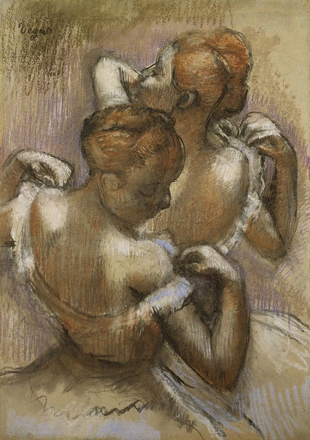 오른쪽: 어깨끈을 조절하는 두 댄서 Two Dancers Adjusting their Shoulder Straps, Edgar Degas, 1897, Fine Art America.