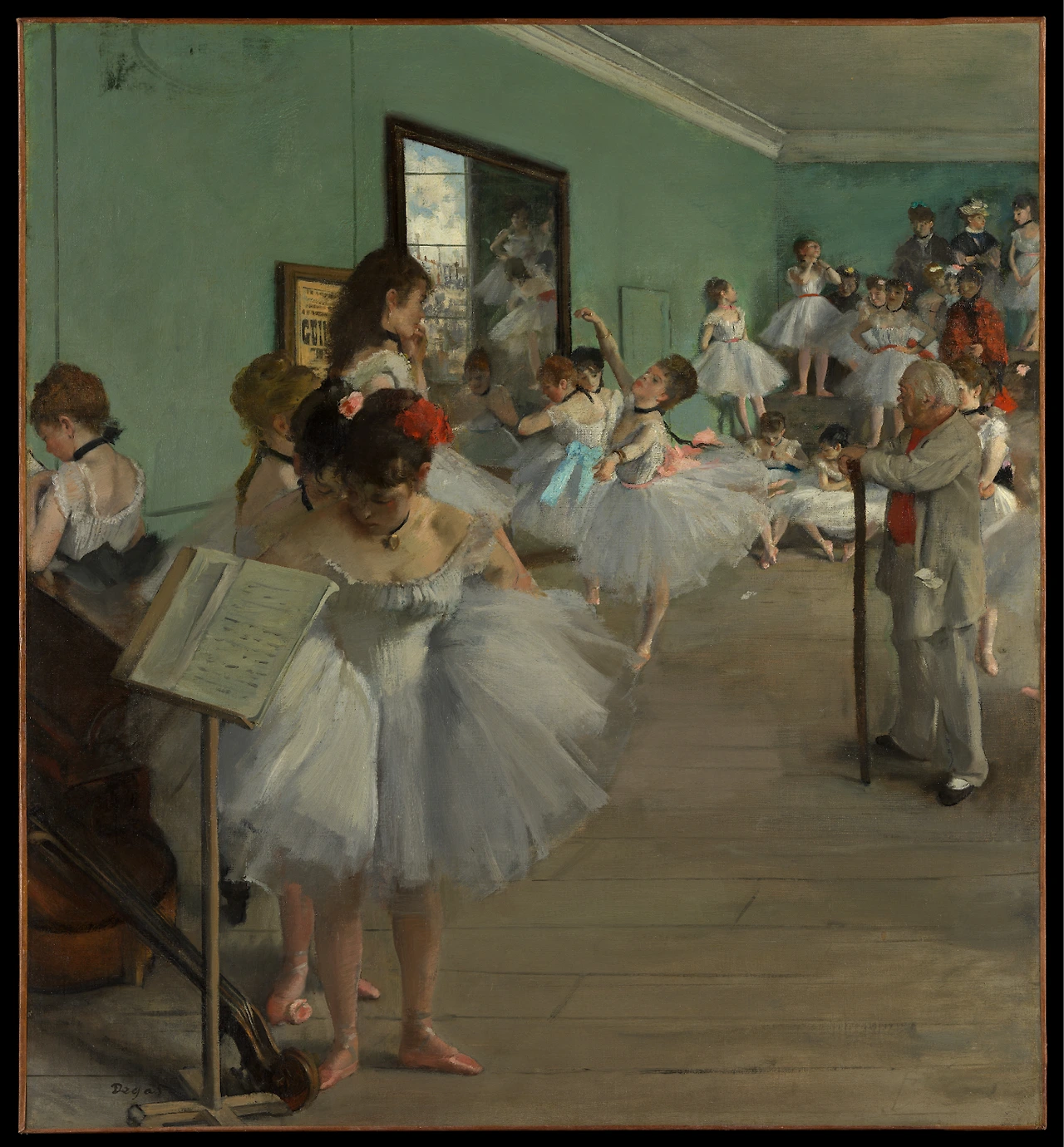 아, 이 그림! 너무나 유명해서 그냥 반갑다. 드가 하면 항상 대표적인 작품 중에 하나로 꼭 등장하는 작품이다. 메트로폴리탄에 있는 작품이니 놓치지 말고 보시기 바란다. 어, 이거 파리의 오르세 미술관에서도 봤던 그림인데? 같은 듯 다른 그림이니 비교해서 보아도 재미있다. 댄스 클래스란다. 모두들 열심히 연습 중인 듯하다. 아니, 자세히 보니 그렇지는 않네? 다들 자기 일에 바쁘네. 여기는 파리 오페라의 리허설 룸, 그런데 사실은 바로 전 해에 불에 타서 없어진 룸으로 드가가 이전부터 들락 거렸던 그 공간을 생각하며 그린 것이라고 한다. 오른쪽 지팡이 들고 서 있는 할아버지가 유명한 발레 마스터인 질 페로 Jules Perrot, 그 바로 앞에 한 댄서가 동작 검사를 체크받고 있는 듯하다. 그 바로 오른쪽에 입가에 손을 대고 쳐다보는 소녀와 바로 옆 소녀가 그다음 체크받을 순서인가 보다. 그녀 바로 뒤에 포스터가 하나 보인다. 이 그림을 의뢰한 바리톤 가수 장 밥티스트 포레 Jean-Baptiste Faure 가 공연하는 오페라 로시니의 빌헤름 텔 Rossini’s Guillaume Tell 포스터이다. 이렇게 그림 속에 의뢰자를 배려한 아이콘까지 넣어 주었으니 너무 좋았겠다.