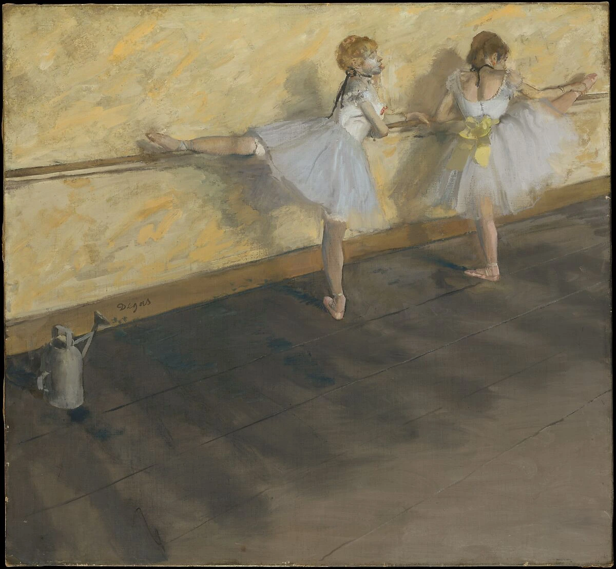두 댄서가 바레를 잡고 연습을 하고 있다. 오른쪽 노란 리본을 차고 있는 댄서는 한쪽 다리를 바레에 얻고 쭈욱- 뻗어 있는데, 어, 이 자세? 왼쪽 바닥에 먼지 나면 뿌리라고 놓은 물뿌리개와 모습이 똑같네? 이건 정말 의도 아니고는 이렇게 그릴 수 없다. 드가, 장난꾸러기네. 그림에 과하지 않은 위트를 하나 둘 넣어 놨네. 하품하는 댄서, 응큼하게 쳐다보고 있는 남자 둘, 등 긁고 있는 소녀, 여기서는 물뿌리개와 똑같은 소녀의 자세! 왼쪽에 있는 댄서도 마찬가지로 한쪽 다리를 올리고 연습하고 있는데 이 포즈, 오른쪽 댄서와 완전 대칭인 데칼코마니인데? 둘 사이를 접으면 둘이 똑같은 자세의 하나가 될 듯 보인다. 너무 재미있다.