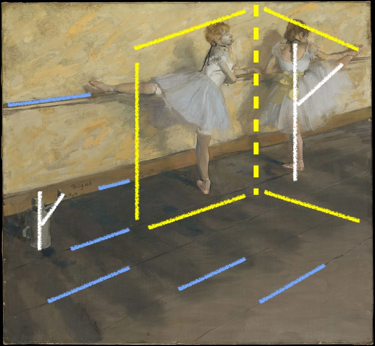 사실 드가의 발레 그림 중에 제일 좋아하는 그림 하나 꼽으라면 나는 이거다. 여러분은? 정말 혁신적이다. 일단은 구도가 파격적이다. 이 그림의 메인 중심이 텅 비어 있다. 그게 너무 좋다. 과하지 않고, 뭔가 가득 채워지지 않고 비어 있는 느낌, 휭 비워 있는 바닥이 이 그림의 주인공 같다. 과감하다. 그림에 자신감이 없으면 이런 그림을 그릴 수 있을까? 나 그림 좀 그리는 사람이야, 따라와 봐! 하는 느낌이다. 이처럼 메인을 휭 하게 비워놓은 그림을 본 적이 있나? 그렇지만 또 우리의 시선을 그 공간에 그냥 머물게 놓아두지도 않는다. 댄서가 잡고 있는 바인 바레 Barre 의 라인, 벽면과 바닥을 잇는 나무 라인, 바닥의 나무판 라인 모두 오른쪽 위로 쭈욱- 우리의 시선을 끌고 올라간다. 그곳에 두 댄서를 두었다. 댄서를 오른쪽 위 귀퉁이로 확- 몰아 버렸다. 이 효과도 참 멋지다. 이 구도 또한 사진에서 습득한 기술이 아닌 가 싶다. 드가, 사진 잘 배웠네.
