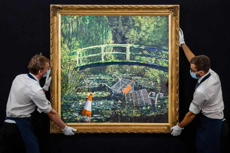 영국의 그래피티 아티스트인 뱅크시의 2005년 전시 ‘크루드 오일 Crude Oils: A Gallery of Re-mixed Masterpieces, Vandalism and Vermin.’에서 발표되었던 ‘모네를 보여줘 Show Me The Monet’ 작품은 모네의 ‘수련이 있는 연못 다리’ 작품을 재해석해 뜨거운 반응을 일으켰다. 뱅크시의 기발하고 절묘한 표현력이 다시 한번 빛을 발하는 작품이다. 어떻게 모네의 수련 작품을 보고 이런 생각을 할 수 있지? 모네의 수련 다리 아래에 우리의 현대 일상생활에서 쉽게 접할 수 있는 마트 카트와 도로의 주의 표시 고깔이 둥둥 쓰레기처럼 띄워져 있다. 현대의 과도한 상업성의 부산물인 쓰레기들이 우리 환경을 어떻게 파괴하고 있는지 직관적으로 너무나 잘 표현해서 감탄과 웃음이 함께 나오는 작품이다. 뱅크시의 이 작품은 2020년 10월 21일 소더비 런던 Sotheby’s London 경매에서 자그마치 $9,968,112 (약 135억 원)에 낙찰되어 또다시 한번 더 우리를 놀라게 했다.