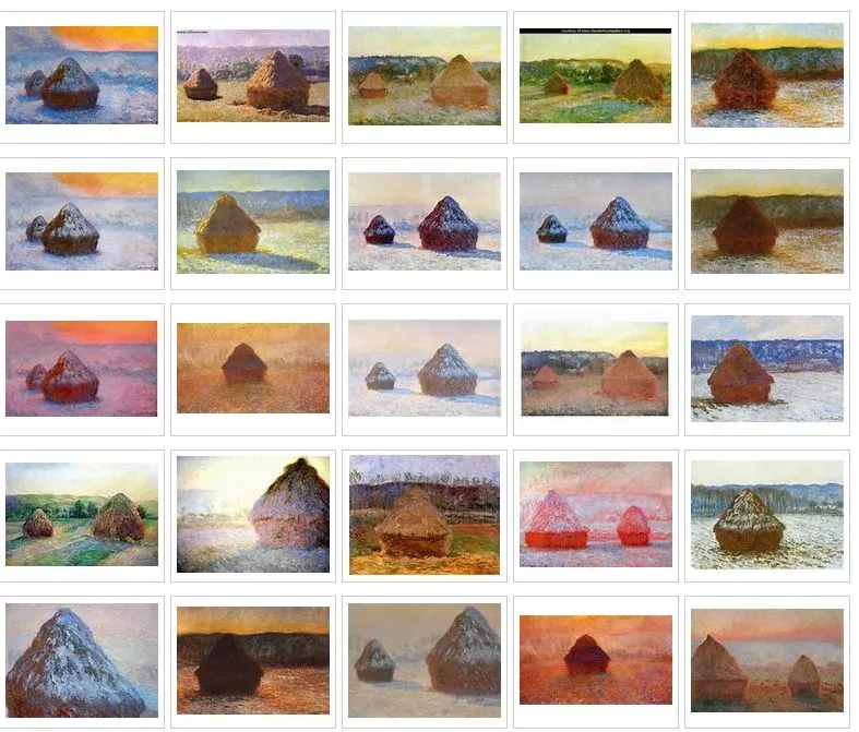 1891년 지베르니에 살고 있던 모네는 집 근처 들판에 쌓여 있는 건초더미를 약 30여 점 그린다. 어떻게 보면 참 특별할 것 없는 시골에서 흔하게 볼 수 있는 건초더미를 이렇게 멋진 그림으로 그리다니 예술가는 시각은 다른 걸까? 처음에는 화창한 날씨와 흐린 날씨의 두 개 작품만 그릴 생각으로 캔버스를 준비하였는데, 그리다 보니 끊임없이 변화하는 빛과 공기의 흐름을 두 개로만 표현하기에는 부족하다는 것을 이내 느낀다. 그래서 더 많은 캔버스를 건초더미처럼 스택으로 쌓아 올려놓고 다양한 빛과 분위기를 담아낸다. 캔버스 스택스 Canvas Stacks… 1차로 야외 현장에서 그리기 시작하고, 나중에 스튜디오에서 수정, 완성한다. 이렇게 모네는 ‘똑같은 그림이더라도 빛에 따라, 공기에 따라, 날씨에 따라, 구도에 따라 다양하게 표현될 수 있다, 이게 바로 인상주의라는 거다’라고 말하는 듯이 작품으로 표현해 낸다.