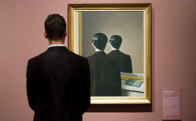 액자 앞의 책이 서로 비춰진 것으로 보아 거울이라고 생각되는데, 거울 앞에 서 있는 남자의 얼굴이 당연히 거울에 비쳐줘야 하는데 또다시 뒷모습이??!! 갸악……. 복제 금지 Not to Be Reproduced, 1937, 르네 마그리트 René Magritte, Museum Boijmans Van Beuningen, Rotterdam