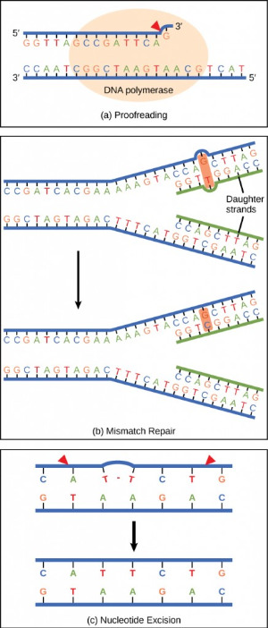 우선, DNA 중합효소 III는 새로 합성된 DNA 가닥을 검사(Proofreading)하고 잘못 삽입된 뉴클레오티드를 제거하는 3'-5' 엑소뉴클레아제 활성을 가집니다. 이는 일반적인 중합 방향인 5'->3'과 반대 방향으로 뉴클레오티드를 분해할 수 있는 효소로서의 활성을 갖는다는 뜻입니다. DNA 중합효소 III에 의해 잘못된 염기는 제거되고 올바른 염기로 대체된 다음 중합이 계속됩니다.